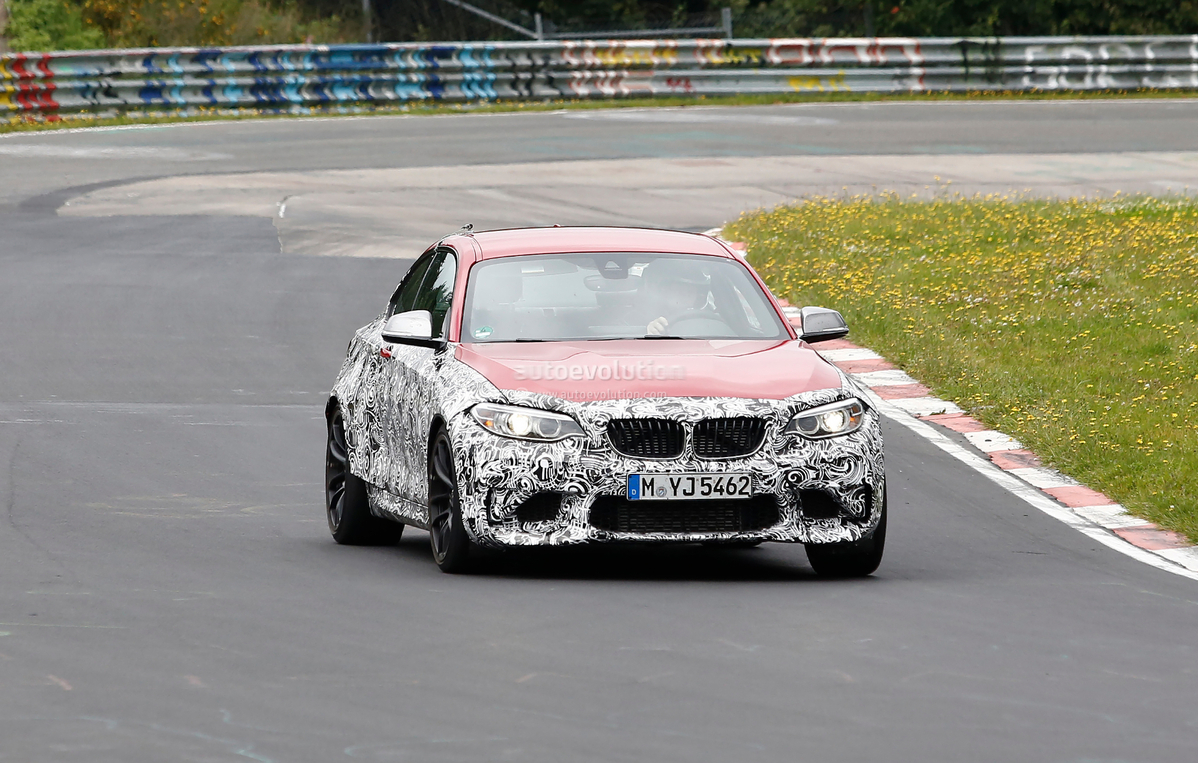大約兩個月前,國外媒體便已在路上擄獲一部貼有偽裝圖騰之黑色塗裝BMW 2-Series雙門跑車,擁有寬車體葉子板的它當時便被外界推測乃即將問世的BMW F87 M2 Coupe,隨後沒多久又與BMW F80 M3雙雙現身街頭,而如今再次現身的場景便是祖國的紐柏林賽道(Nurburgring Nordschleife),原廠安排的密集測試更加暗示著這部嗆辣雙門小跑車的即將到來。這次被拍到的BMW F87 M2 Coupe以亮眼的Sakhir Orange金屬橘色現身,雖然同樣身披偽裝圖騰,但輪廓較先前明顯許多,除了後視鏡、側裙組與後行李箱蓋依然與普通版本F22 2系列所使用的相同外,應當已經裝上BMW準備給M2 Coupe的部分專屬空力套件,而前保桿與後保桿處都能依稀看到M2 Coupe的全新設計。