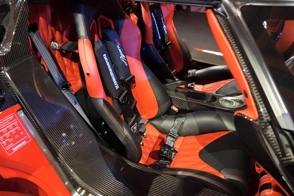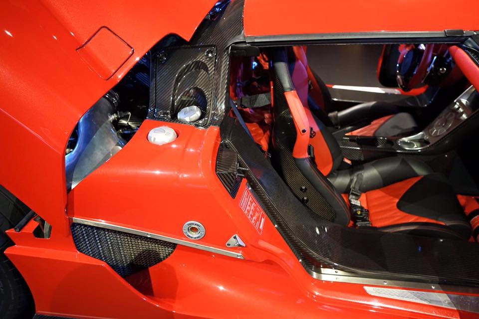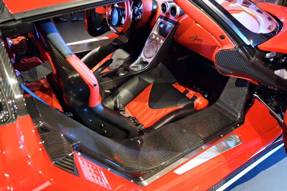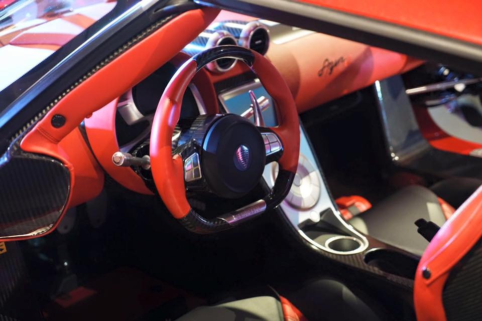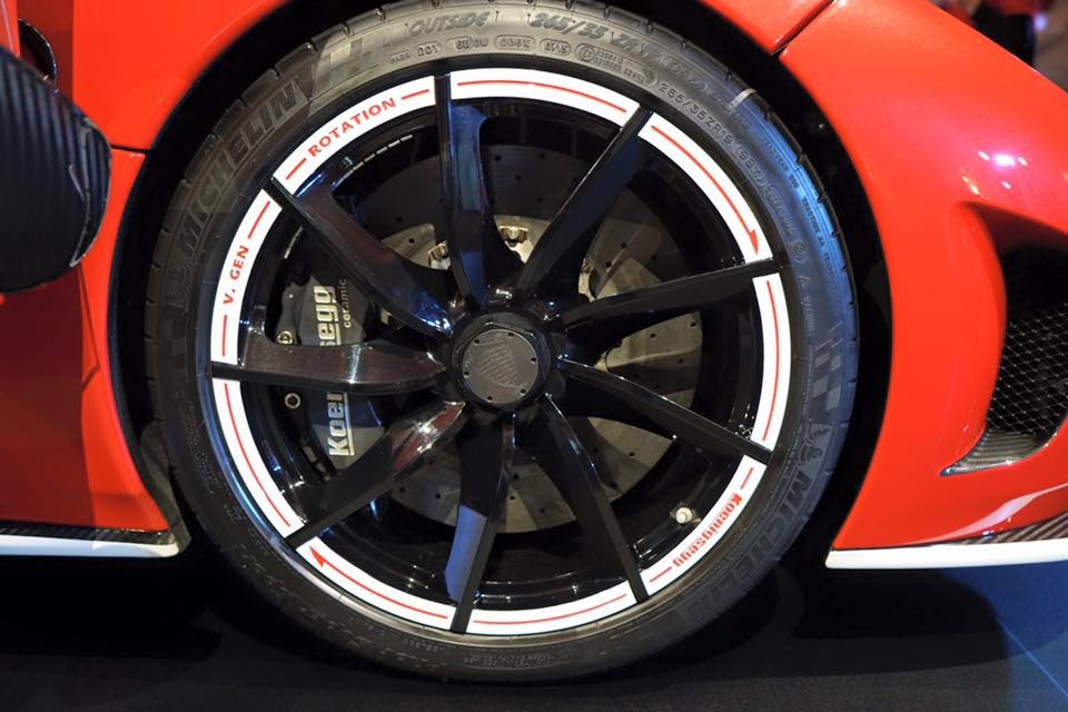 外觀部分,這部Koenigsegg Agera R採用火紅色塗裝搭配碳纖維紋路,並在空力套件下緣與輪圈外圍施以白色對比塗裝,展現濃烈跑格。