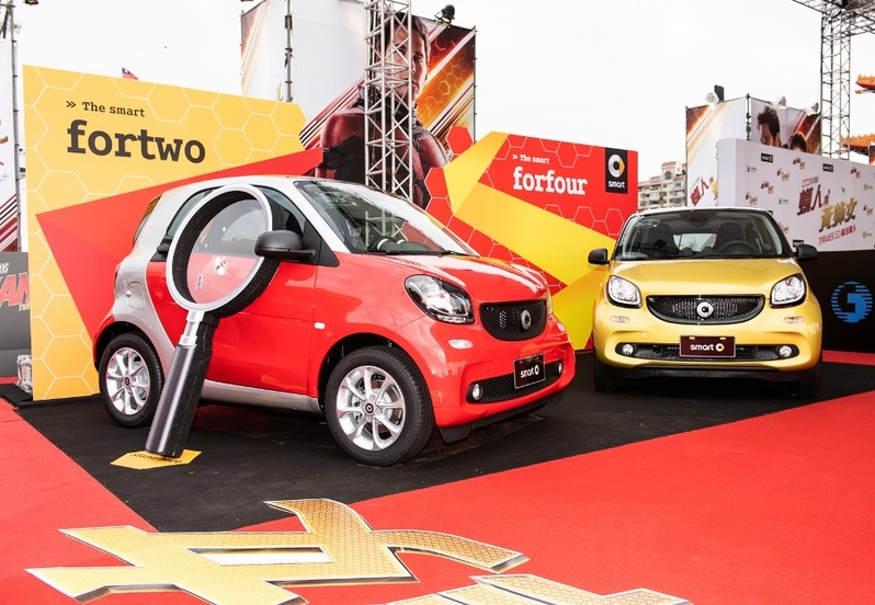 台灣賓士為了歡迎漫威電影宇宙超級英雄首度來台,除了派出豪華旗艦 Mercedes-Benz S-Class及頂級休旅 V-Class擔任英雄專屬接送座駕,甚至打造「#smart讓蟻人FUN超大」展車台,以特殊造型的蜂巢式設計呼應即將上映的漫威最新力作《蟻人與黃蜂女》,整體展區以活潑搶眼的紅色及黃色為主軸,擺放呼應英雄配色的都會時尚小車 smart fortwo 與 smart forfour,透過車身旁的巨大放大鏡,眼尖的影迷甚至能發現車窗上竟有攀爬的螞蟻及飛舞的黃蜂。