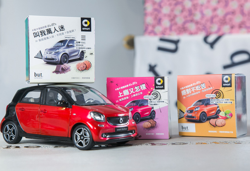 除了打造民生社區快閃店,smart也將在10月至12月北中南巡迴快閃店,第一站將於10/4-28設在台北信義誠品、11/3-27於台中大魯閣新時代廣場、12/3-30於高雄大魯閣草衙道 異想空間。最夯快閃店以「敢」為主題,直接設計一個小型停車場在室內,搭配亮橘色的smart fortwo吸睛十足!就是要讓路過的人都不能忽視smart的「敢」。搭配but.聯名甜點,更推出三款限定獨有的2入but. 聯名款限量禮盒裝甜點!第一款「絕對不吃苦」內含辣嬌喳餅乾+果韻檸檬覆盆子餅,其中辣嬌喳餅乾加入手工拌炒麻辣喳喳,不只香辣,還帶有微麻的特殊口感,大膽的食材組合與smart的tridon 撞色組合不謀而合。第二款「上癮又怎樣」內含癮者摩卡餅+辣嬌喳餅乾,保證不吃還好一吃就上癮,小心體驗過最靈巧的smart保證你上癮!第三款「叫我萬人迷」內含討喜巧克力+爽朗瑪德蓮,甜蜜滋味讓你化身萬人迷,smart就是個繽紛討喜的萬人迷!現場可互動製作個人專屬獨特「敢,我說的算」宣言影片,只要完成體驗並上傳打卡分享,就可以獲得隨機贈送的限量聯名餅乾!