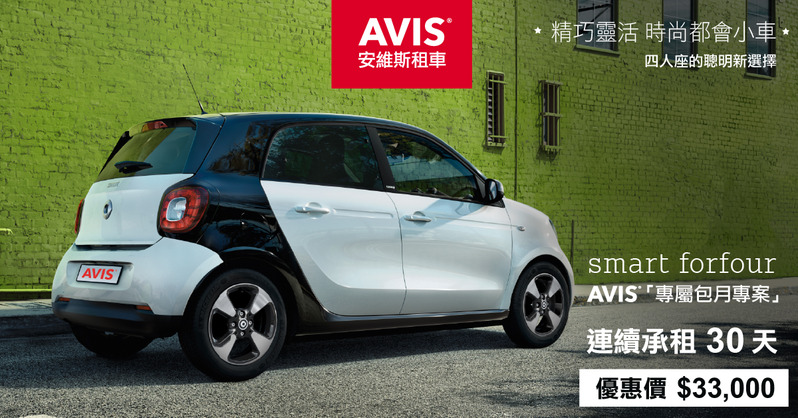 只要愛上smart 的靈活時尚就很難變心了!當有租車需求時,還要是租smart,全球的合作夥伴AVIS安維斯租車聽見廣大smart鐵粉的心聲,推出為月租需求顧客量身打造的smart forfour「專屬包月專案」,原價每日租費為2,800元,一個月需要84,000元,現正推出月租新態度EasyGo專案限定,每月只要33,000元就能天天開smart,省下超過5萬元!另外,若是想短期租賃smart,消費者於AVIS安維斯租車官網免費註冊會員,選擇「時尚都會小車 smart」,就能享平日7折(週一至週四)及假日8折(週五至週日)優惠,感受新世代冒險挑戰的樂趣,就趁現在。數量有限,立即預約:https://lihi.cc/P9FEE