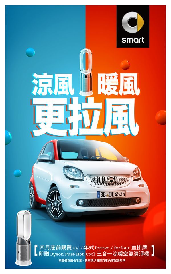 smart都會小車已經成為年輕族群聚焦的流行icon,在都市裡,以高靈活度、小迴轉直徑、獨特與舒適的個人空間,獨樹一格的簡約設計,造成好評不斷。而在外有最潮都會首選微型車smart,在家當然也要有一台最潮的設計小家電。「smart好拉風專案」即日起只要入主18/18年式smart全車系,並於四月底前交車領牌,即可獲得Dyson Pure Hot +Cool三合一冷暖空氣清淨機 (含 HEPA濾網及活性碳濾芯 一組),總價值超過30,000元,共兩色可供選擇 (鐵藍色、銀白色),或選擇「三年保養套裝」輕鬆養車,好禮二選一;讓你初春不論是涼風暖風更拉風。