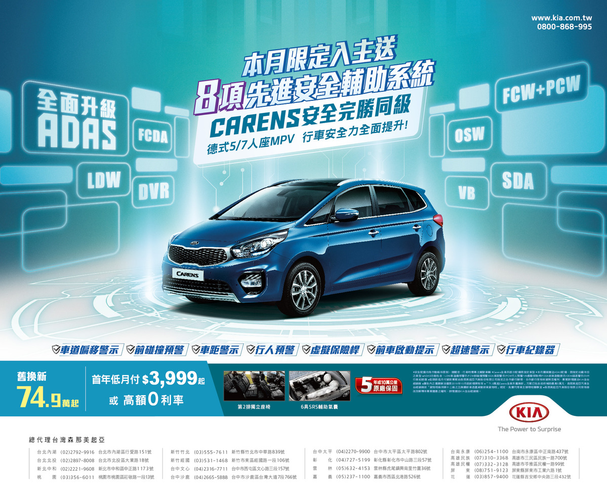 新世代KIA自車體設計與打造開始,即以安全為最高準則,只為提供車主與乘員一個更安心的乘車空間,更放心的駕車體驗。本月購車,歐風潮流新貴Picanto指定車型免費升級ADAS先進駕駛輔助安全系統配件,提供行車安全加倍保障。此外,安全、空間、油耗、動力與科技一路完勝的最強國產MVP—Carens指定車型,安全再升級,加碼贈送倒車顯影系統與ADAS先進駕駛輔助安全系統配件,搭載更加全面、完整且傲視同級距的安全配備,守護駕駛及乘客的行車安全。