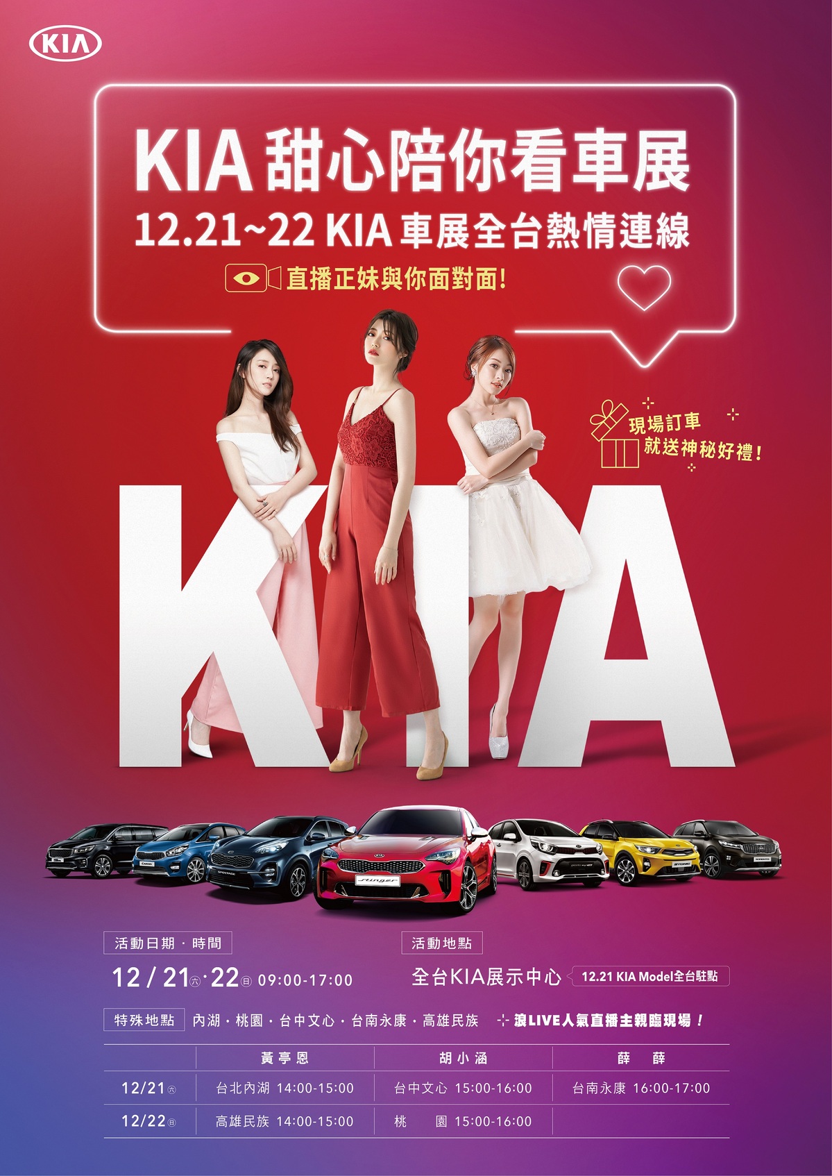 在感恩的12月,森那美起亞搶先打造KIA專屬全台車展,並於本週末提前開跑讓全台消費者都可以一起感受新世代KIA車款的驚人魅力。森那美起亞更與台灣人氣直播平台「浪LIVE」合作,將於12月21日於台北內湖、台中文心與台南永康三地展示中心,邀請甜心直播主,素有「美聲公主」之稱的黃亭恩、歌聲甜美時常出席時尚活動的胡小涵,以及能歌能寫,也是旅遊專欄作家的薛薛於三個展間直播,將與現場民眾一同闖關,協助參賽者獲得KIA專屬好禮。12月22日當天黃亭恩與胡小涵兩位超人氣直播主將前往高雄民族及桃園兩間展示中心,與現場民眾互動闖關,一同感受全新KIA全新世代的車款。此外,只要顧客與KIA Model合影拍照於個人FB分享、當地展間打卡,且在KIA 台灣官方Facebook粉絲團按讚,就能獲得KIA精美小禮(數量有限送完為止)。