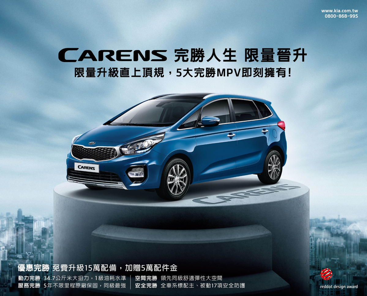 KIA台灣總代理森那美起亞汽車秉持著提供消費者最佳用車品質的核心理念,於本月特別推出「Carens完勝人生 限量晉升」專案,現在入主,即刻享有指定車型,免費升級價值15萬元配備與5萬元配件金優惠、5年不限里程原廠保固等5大完勝優惠。坐擁家庭用車族群首選、最強國產KIA Carens,限時限量優惠實施中,心動,請立即行動。