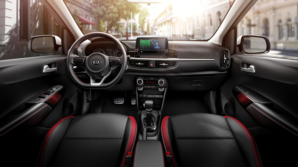 All-new Picanto不僅外型進化更吸睛,內裝設計與配備,也同樣傲視同級車款。All-new Picanto的內裝設計透過多層次的線條勾勒搭配多樣化材質,以出色的質感氛圍,顛覆過往入門小車就是陽春的刻板印象。X-LINE及GT-LINE更採用與KIA旗艦轎跑Stinger同血緣的D-Cut跑格化方向盤,搭配全新升級的皮質排檔桿,與鋁合金油門/煞車踏板,讓運動基因內外相互呼應。在車室內裝部分,X-LINE及GT-LINE亦個別採用不同的設計:X-LINE採用綠色幾何線條搭配灰色烤漆門飾板,皮椅則採用黑灰雙色皮革搭配綠色縫線;GT-LINE則是在黑色門飾板以紅色線條妝點,並搭配黑紅雙色皮椅與紅色縫線,營造其專屬跑格。