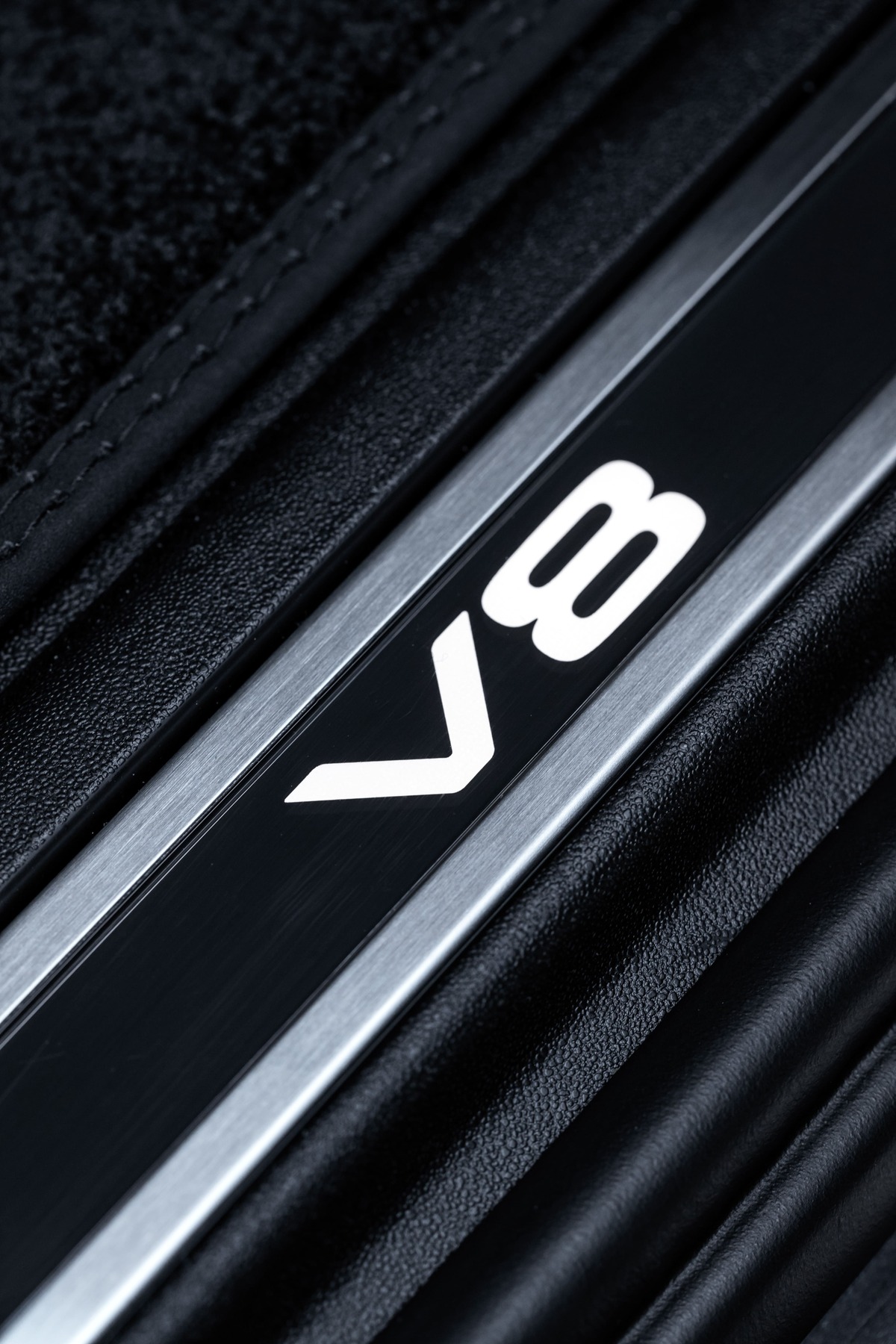 當車門開啟時,映入眼簾專屬車門發光金屬門檻含V8專屬徽飾與貫穿中控儀錶的專屬緞光黑色裝飾,彰顯其不凡的定位。全車座椅採頂級溫莎皮革搭配Dinamica® 類麂皮與耐磨織布包覆,提供最舒適的乘坐品質,四幅式多功能方向盤採麂皮包覆,並具備電動調整與加熱功能,換檔撥片搭配更為精緻的鍍鉻材質,排檔桿以及中央飾蓋則採皮革包覆,車室內透過全面革新的設計與運用大量頂級材質交織,展現現代奢華的設計美學風格。
