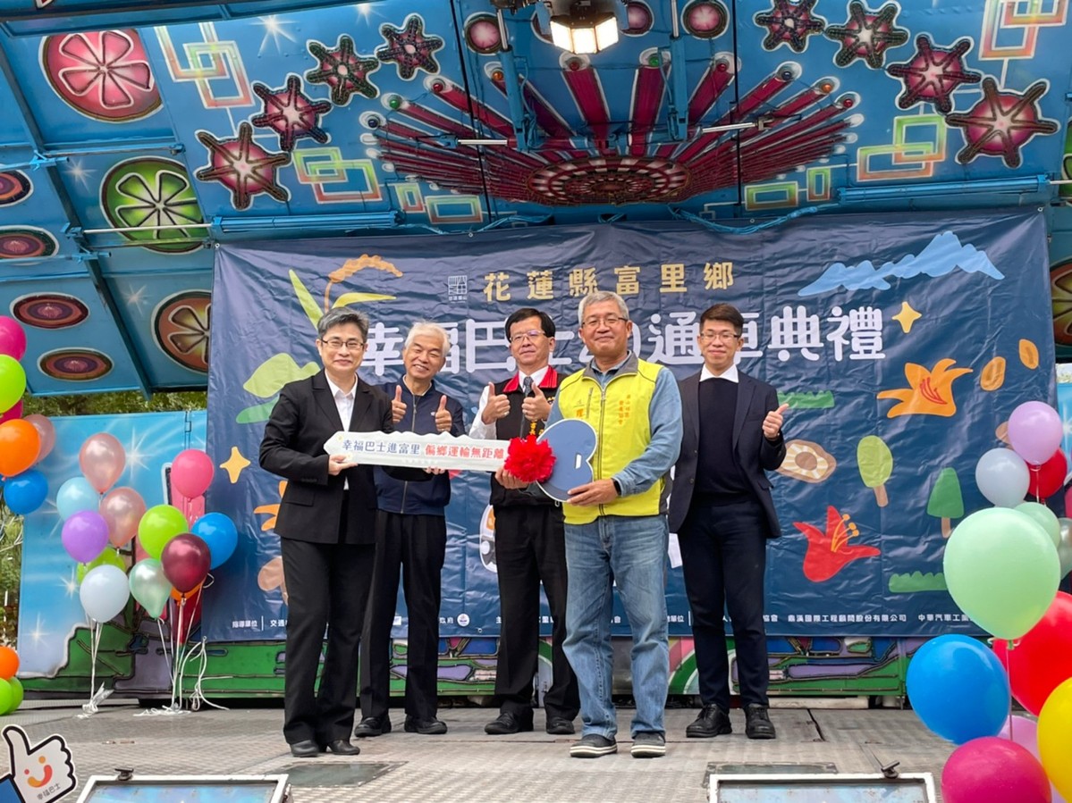 由郵政協會捐贈;中華汽車提供後續保固之「花蓮富里鄉幸福巴士」自9月示範運行以來,服務人次達1,679人次,累積接駁里程共7,570公里。11月底加入正式營運後,將持續提供民眾3個月免費搭乘服務,車輛上路後,不僅解決學田國小、富里國中學區內等4所學校學童接駁問題,也滿足了長者跨區移動至醫院就診的交通需求。