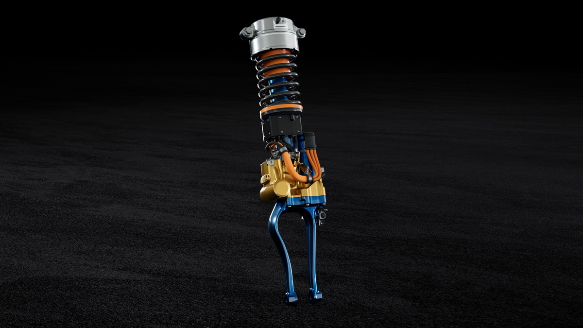 法拉利主動懸吊系統更有一大優勢,體現在真正主動式滑閥系統的48 V電動馬達執行器往減震器工作方向施加作用力時的速度。法拉利專為新車聯合設計了高功率密度三相無刷電動馬達,該電動馬達採用無槽定子繞組技術,盡可能縮短徑向尺寸並且最大限度提高功率密度。從機械角度來看,通過與液壓減震器活塞桿的雙絲滾珠螺桿直接相連,電動馬達作用力以一種新穎的方式進行傳遞,從而實現高頻響應並減小摩擦、慣性和封裝空間。
