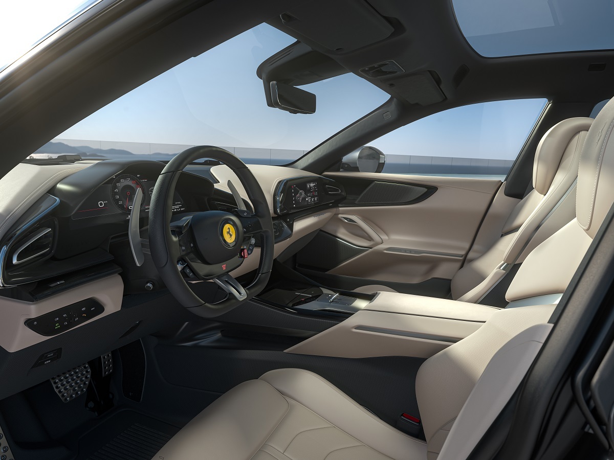 Ferrari Purosangue的座艙在空間佈局和裝飾細節方面力求精益求精,並且採用各項頂級材料,為這輛四座佈局的躍馬新車提供前所未有的乘坐空間和駕乘舒適性。無論在視覺或感官層面,新車座艙都堪比一間無比優雅且又動感十足的貴賓室。打開車門時,格外寬綽的車室空間令人眼睛為之一亮,而精緻豪華、現代優雅的內裝氛圍更是讓人驚艷。現代設計語彙與法拉利標誌性的GT跑車設計美學和諧交融,所有元素均經精心設計、保持緊湊比例,優化整體座艙空間和人體工學性能。