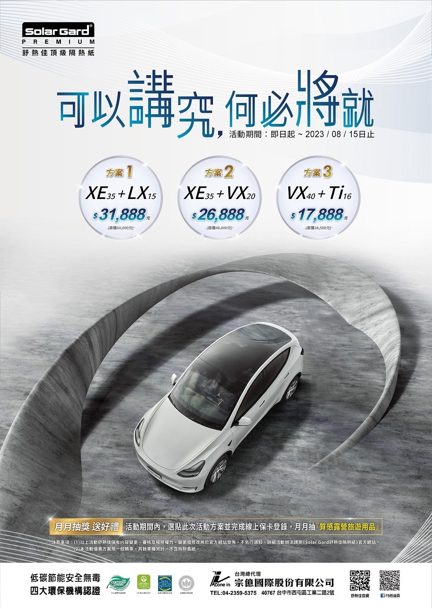 為完美呼應汽車的流線外觀,舒熱佳Xenith(XE)系列此次推出時尚經典的永恆黑色系,在高隱密度的同時仍保有清晰視野,並備有多種透光度可以選擇,可由消費者隨心搭配;新上市期間亦推出兩種優惠組合,讓消費者可以在前檔車窗採用全新XE奈米陶瓷隔熱紙系列體驗到先進奈米材質為前車座位提供清晰視野格局、又能沉浸在經典沉穩的安全舒適、與駕馭自如不用擔心訊號感測的自在感;而側面與後座的玻璃則可選擇搭配「LX鑽石金屬隔熱紙」(專案優惠價31,888元;原價50,000元),達到全方位的隔熱以及防爆的安全效果,或是搭配「VX頂級奈米陶瓷隔熱紙」的高度奈米化的材質(專案優惠價26,888元;原價46,000元),達到清晰視野同時又能保有車內隱私組合;詳細優惠內容請參考www.solargard.com.tw