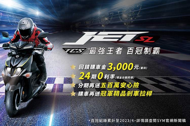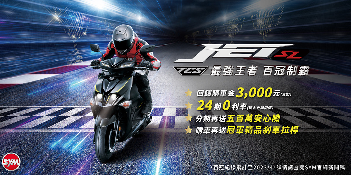 SYM邀您親自騎上JET SL,親自感受JET SL的百冠風範與魅力!現在入主TCS致競版,不但能立即享受超高CP值的「雙電控安全系統」升級,還現折3,000元購車金回饋(直扣) 、冠軍精品剎車拉桿和24期分期0利率,分期購車再享500萬安心險!想一圓駕御冠軍車夢想的你,真的別再猶豫,現在肯定是最好時機!