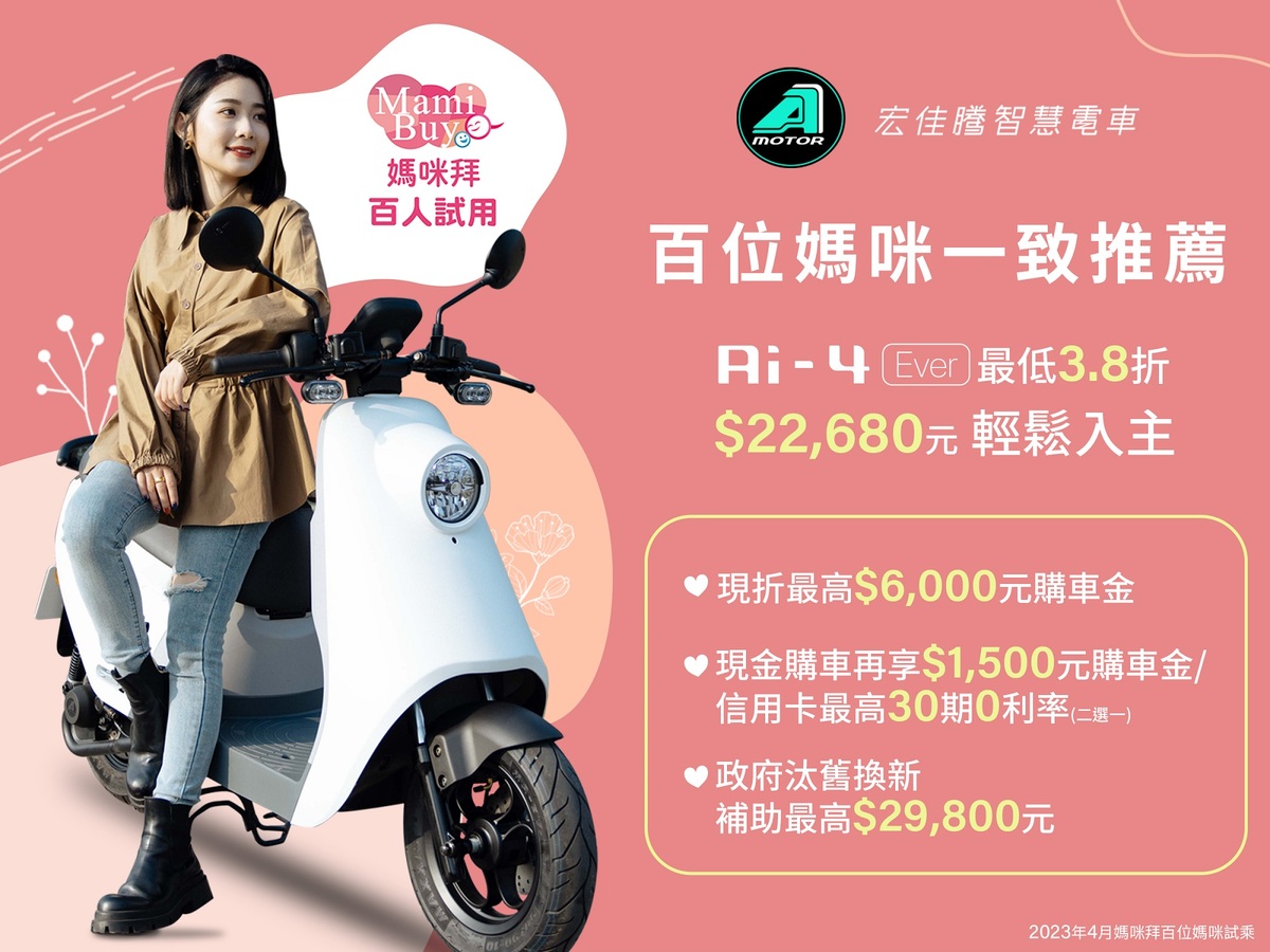 除一系列歡慶25周年的活動外,宏佳騰更致力於為顧客帶來更完整、滿意的服務,讓消費者可以安心選購精緻且創新的優質產品,也將持續提供購車優惠回饋消費者。其中,專為女性量身打造的質感電車Ai-4 Ever,並獲得擁有86萬會員網站「媽咪拜MamiBuy」親子平台的百位媽媽一致推薦。不僅清新簡約的時尚外觀擄獲女性消費者芳心,同時73cm同級最低座高、車架強化的高穩定度、73kg輕量好移動、超好立省力中柱、大容量置物空間、加大平坦腳踏空間、無排放無震動的清爽騎乘感受,讓每一位媽媽們都能夠輕鬆、優雅地出門。搭配輕鬆換電的單顆電池配置以及內建測速照相/換電提醒功能的CROXERA Q智慧儀表,各項貼心設計,讓Ai-4 Ever成為媽媽出門在外的最「神」隊友!即日起至6/15止,電動車汰舊換新補助最高29,800元,加碼送6,000元購車金,現金購車再享1,500元購車金,最低3.8折,只要22,680元就能把輕質感系電車Ai-4騎回家。宏佳騰就是要讓媽咪們的選擇物超所值。更多試乘分享,請上媽咪拜網站:https://mamibuy.com.tw/talk/forum/topic/445739