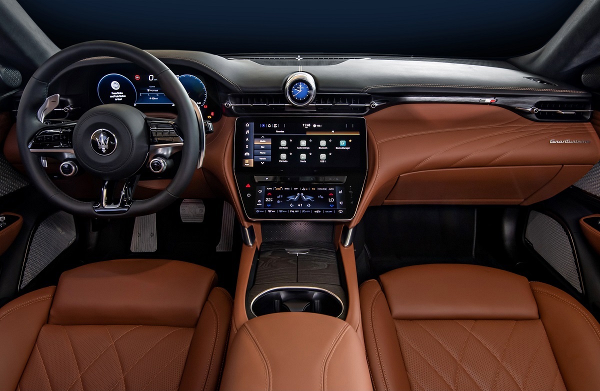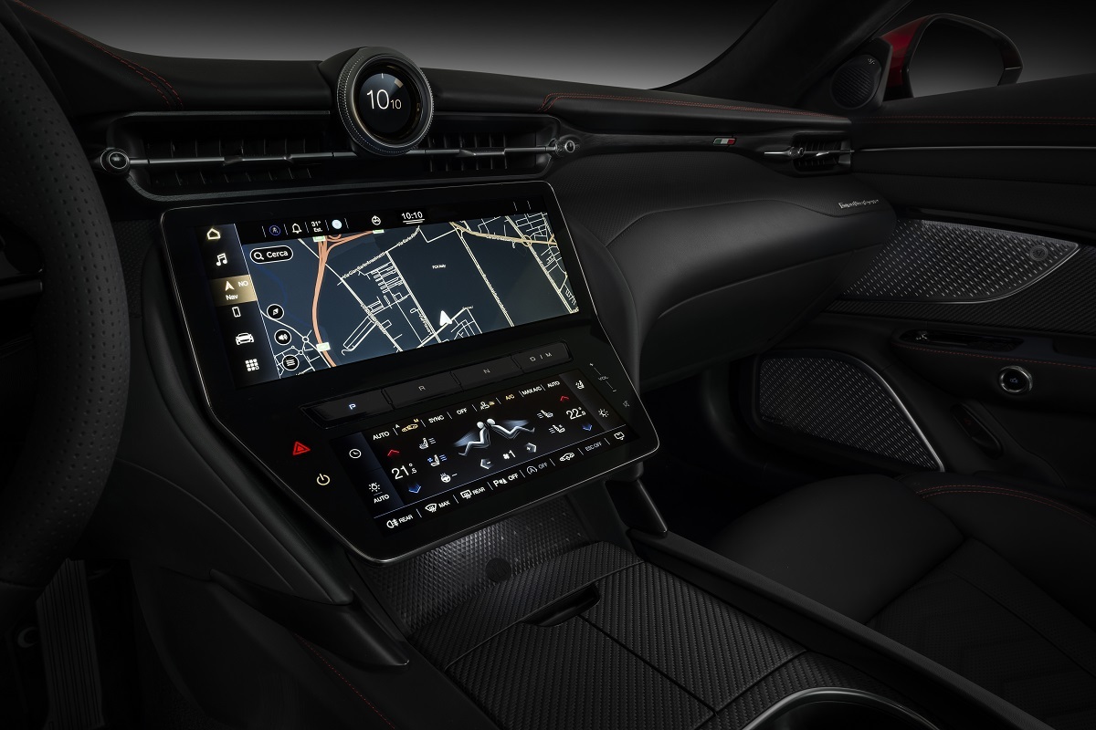 科技與現代工藝的巧妙平衡進一步賦予全新 GranTurismo 前所未有的駕駛體驗,集結多項創新技術而不失優雅設計的現代數位化座艙,透過駕駛座的馬鞍型12.3吋數位儀錶,能夠更好地貼合方向盤上半部造型、帶來更豐富的資訊顯示能力。俐落現代的中控介面採一體式玻璃面板完整連接,包含上方 12.3 吋中央觸控螢幕,與下方可調整空調、座椅、燈光等功能設置的8.8吋舒適觸控螢幕,並將排檔功能以按鈕方式整合其中,提供更加直覺的人性化體驗。三叉戟品牌標誌的石英鐘亦更換全新面貌為智能數位時鐘,提供三種錶面模式與多達 9 種以上的功能,提供前衛科技卻不失經典的功能造型,同時搭載最新 2.0 Maserati 智能輔助多媒體系統