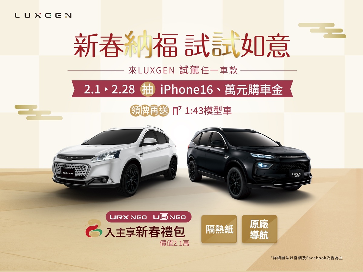 除了純電休旅n7全車系購車優惠外,同步再祭出U6 NEO、URX NEO黑+特仕版超值回饋:凡於2/1(六)至2/27(四)來店試乘任一車款有機會抽中限量「iphone 16」,購車再享「新春禮包」,包含:隔熱紙、原廠導航等總價值達2.1萬元,領牌再送n⁷ 1:43合金模型車,歡迎喜愛LUXGEN的準車主們,敬請把握最佳入主時機,輕鬆坐擁全方位智慧科技的駕馭魅力。欲知更多車款優惠詳情,歡迎至LUXGEN官網預約來店賞車,或電洽客服專線0800-588-088。