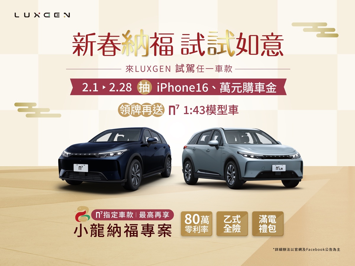 試試如意」多重購車優惠方案,讓您蛇年新春事事如意、大吉大利。凡於2月份試駕LUXGEN全車系任一車款,就有機會抽中限量「iphone 16 」、萬元購車金;入主純電休旅 n7或 n7 LR長程版特定車型,可享四年最高20%充電點數回饋(1)(2),再送家用充電樁或2.6萬自由配,領牌再送n⁷ 1:43合金模型車;同步再享指定車款「小龍納福」等多項純電休旅獨享優惠,敬請把握新春開工最划算的購車機會,讓您開春贏得好兆頭、歡喜迎接金蛇年!
