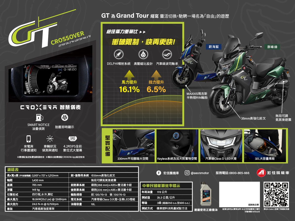 STR 300 GT依照汽車等級高規格打造,搭載Class D LED大燈及採用汽車級高強度車架,確保車主擁有最頂級的駕馭樂趣。標配35mm高強化前叉和MAXXIS半熱熔R1N輪胎,在騎行時達到操控及穩定的完美平衡。4.2吋IPS全彩數位式大螢幕簡潔明瞭,安全輔助每次出行。現正推出「蔚海藍」和「群峰綠」兩款車色,詮釋STR 300 GT跳脫規則的壯遊姿態,建議售價149,800元。