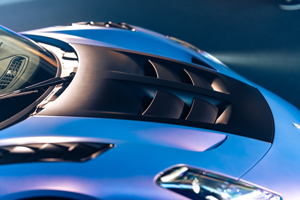 外觀設計上,GT2 Stradale 延續 Maserati GT2 賽車銳利奔放的輪廓語彙,低伏而寬闊的車頭線條營造出超跑獨有的強悍氣場,碳纖維前下擾流與 100% 碳纖維前艙蓋上的大面積出風口,不僅優化空氣力學效能,同時強化冷卻表現,展現源自賽道的技術本質。全新設計的煞車冷卻進氣口與大型前格柵整合藍色三叉戟標誌,形塑極具辨識度的視覺衝擊;選配的前輪拱碳纖維格柵式出風口有效排出煞車熱氣,提升散熱效率。車側則以 GT2 Stradale 專屬銘牌彰顯其尊榮定位,經典葉子板通風口移至後窗中央位置,搭配醒目的進氣設計,強化引擎散熱表現。車門採用與 MC20 同款蝶翼式側掀設計,延續賽車基因同時提升上下車便利性。車尾部分,全新三段式可調整消光碳纖維後尾翼可依據駕駛情境所需之下壓力需求靈活調整,強化高速穩定性與刁鑽操控性能表現。