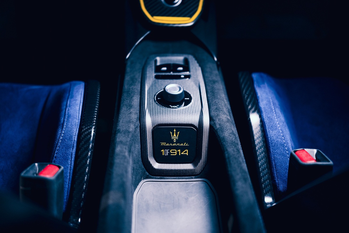 儀表板搭載 10.25 吋 TFT 數位螢幕,提供多項客製化設定。中央區域則配置同樣為 10.25 吋的高解析觸控螢幕,可用以顯示並分析車輛性能數據;全新設計的碳纖維中控台,僅保留最核心的駕駛控制功能,包括駕駛模式切換、排檔控制與倒車按鍵,呼應義式美學設計語彙。音響系統可選配來自義大利頂級音響品牌 Sonus faber 的頂級音響系統 (12支揚聲器),進一步提升車室聽覺體驗。 GT2 Stradale 全球限量僅 914 台,中央鞍座特別鑲嵌「1 of 914」銘牌,向品牌創立年份 1914 年致敬,象徵 Maserati 成立 110 年來不斷突破的先鋒精神。