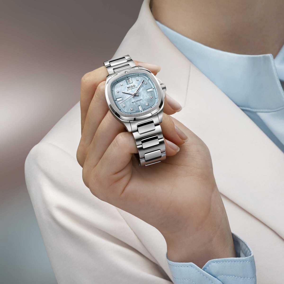 首先推薦如夢似幻的藍色珍珠母貝錶盤為視覺焦點,隨光線變化呈現迷人色澤,如同夜空中閃耀的星光。搭配八顆鑽石時標,呈現高雅而閃耀的氣質。35 x 34.2毫米的精鋼錶殼展現俐落線條,呼應1973年電視機造型設計,獨具懷舊韻味。內部搭載MIDO Caliber 72自動上鍊機芯,擁有長達72小時動力儲存與Nivachron™鈦合金游絲,具備優異的抗磁抗震性能,陪伴母親從容面對生活節奏。建議售價為新台幣39,300元。