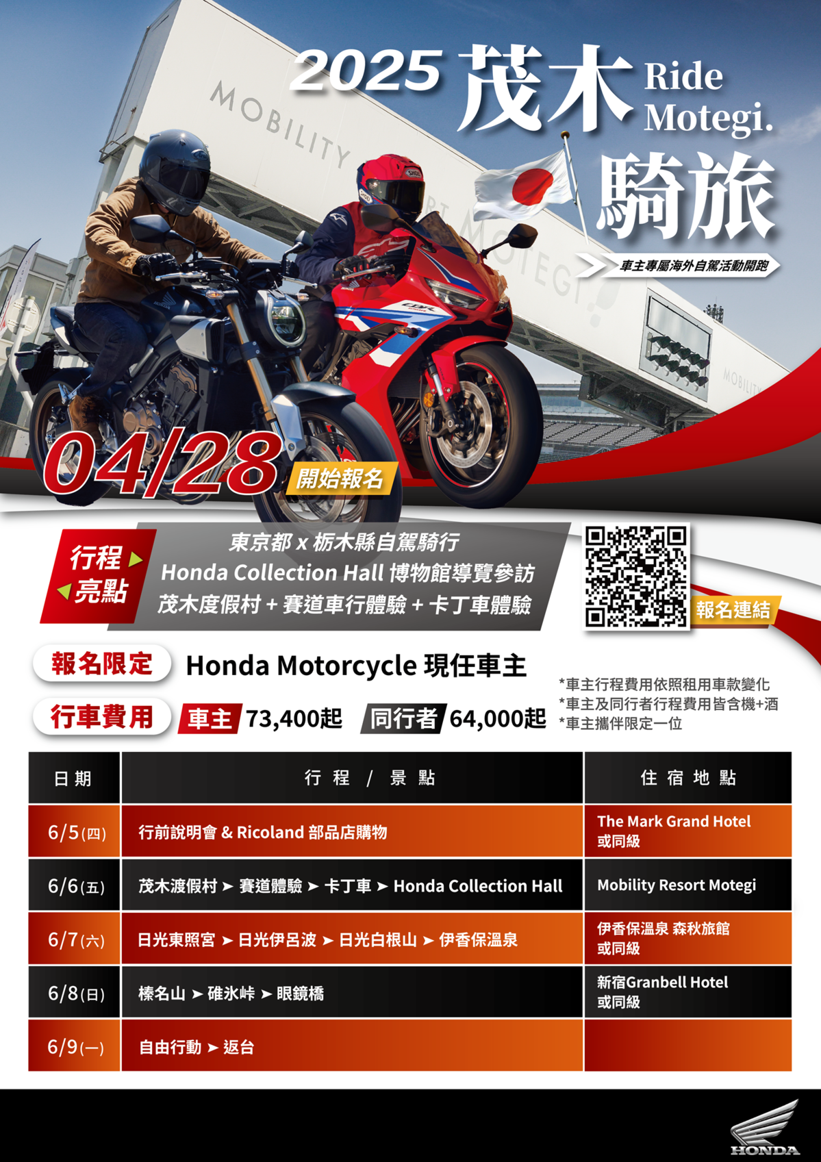本次五日茂木騎旅,Honda Taiwan精心規劃了豐富多元的行程,包含在享譽國際的茂木賽道享受Honda人氣機種的騎乘樂趣,並安排參觀Honda Collection Hall(本田博物館),讓車主們深入了解Honda的歷史、技術與創新。行程中將由專業領騎團隊全程陪同,共同遊歷栃木縣周邊的自然風光與人文特色、品嚐道地的日本美食,為車主們打造一趟無後顧之憂且兼具騎乘樂趣與沉浸日本文化體驗的深度旅程。歡迎熱愛Honda的所有車主共襄盛舉,相關資訊將發布於Honda Motorcycle Taiwan粉絲專頁,並於4/28開始採線上報名,限量名額,額滿為止!