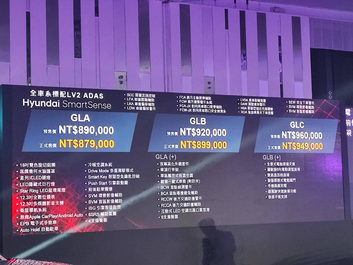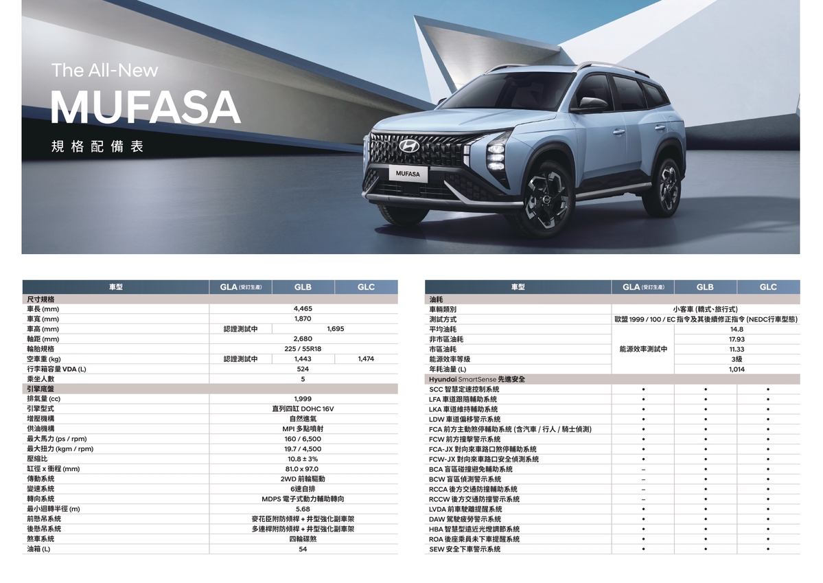 HYUNDAI汽車全新推出的亞太戰略車型——The All-New MUFASA今日(14日)正式上市,為C級SUV市場注入全新能量。全車系三車型,正式售價分別為GLA 87.9萬元、GLB 89.9萬元、GLC 94.9萬元憑藉著現代前衛設計語彙、豪華配備、超格空間與領先同級的安全科技,以「超規格SUV」為產品訴求,提供消費者超越期待的用車體驗。