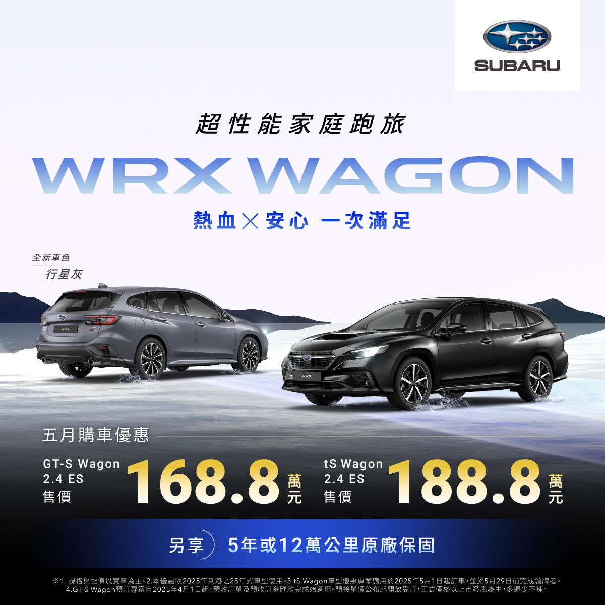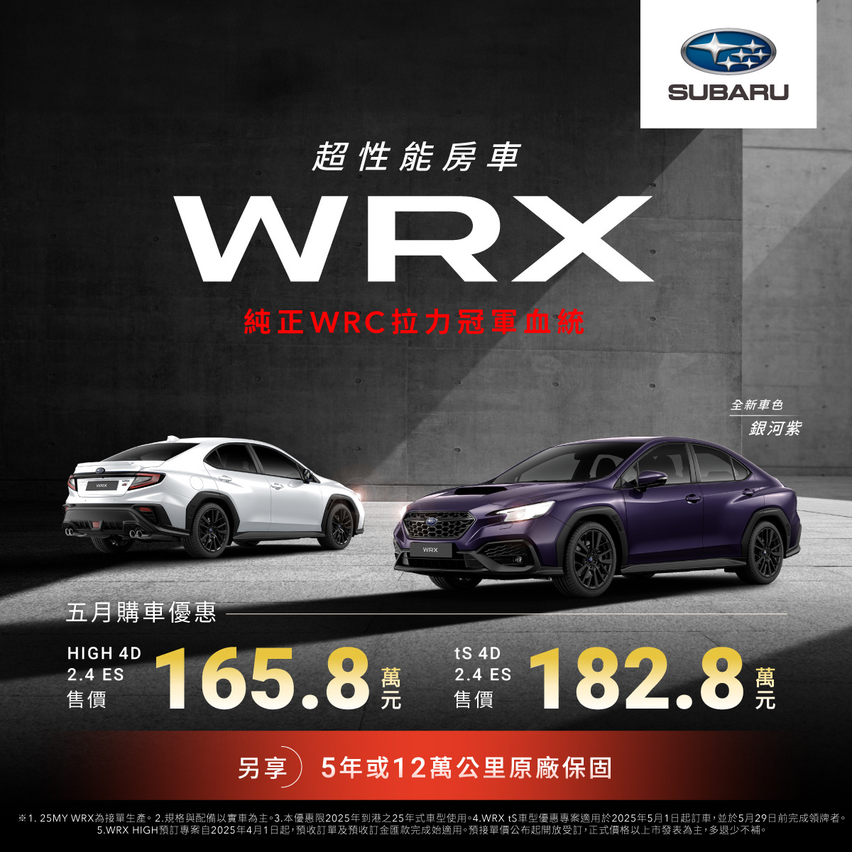 SUBARU台灣總代理意美汽車五、六月間活動不間斷,25MY WRX與WRX Wagon宣布正式上市,並開始陸續進駐各展示據點。同時也擴大舉辦五月試駕祭活動,快閃限定優惠加碼,並提供重磅老車主專屬回饋,邀您盡享SUBARU魅力好車。而最讓SUBARU車主與粉絲們引頸期盼的「2025 SUBARU 賽道家庭日」活動,更同步預告將於5月21日上午9時開始接受網站報名。