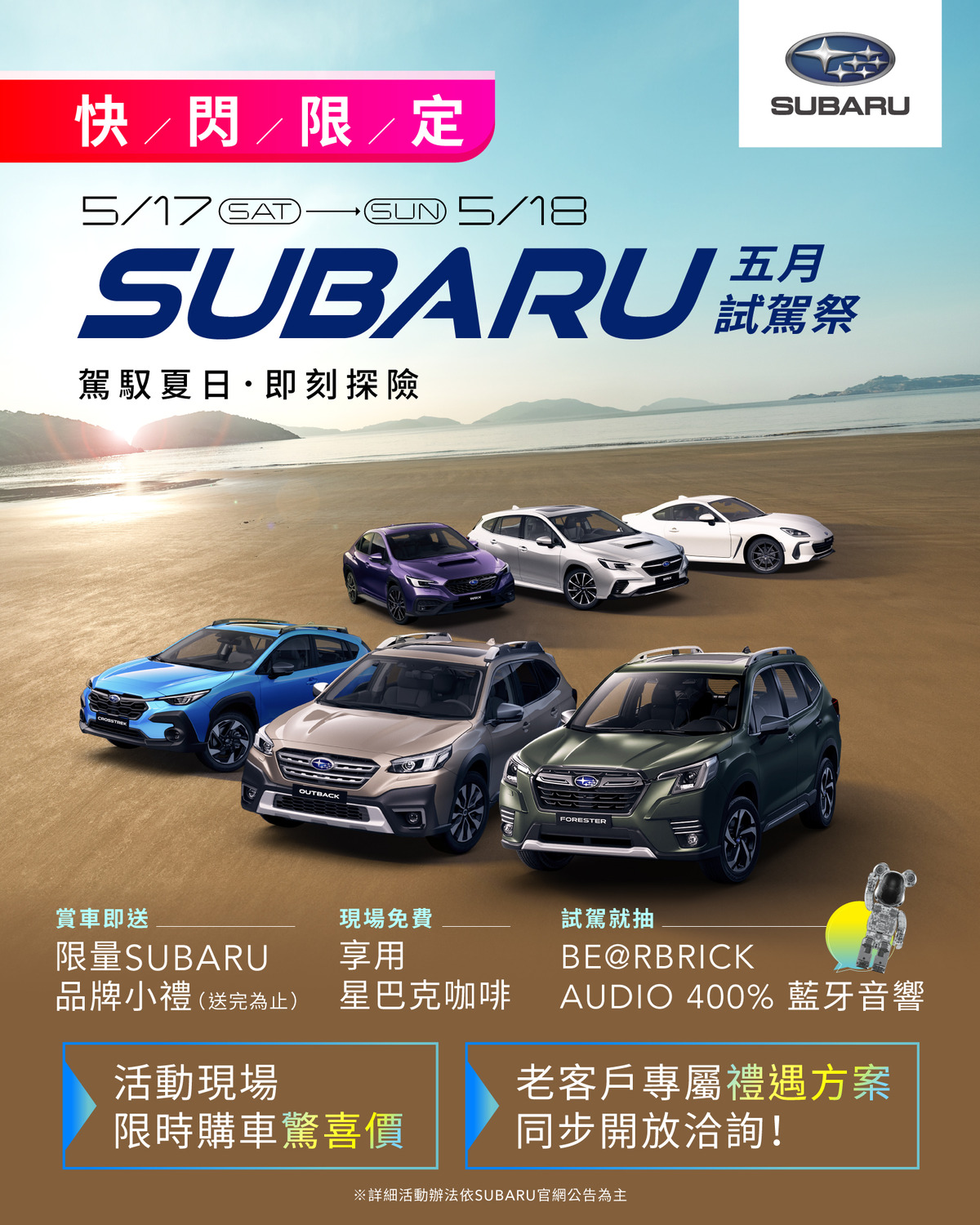 活動期間也同步推出限時購車驚喜價與老客戶專屬禮遇專案,提供最具吸引力的購車方案,協助您輕鬆入主夢想車款,也為一路走來堅持相挺的忠誠車主提供專屬禮遇方案,感受品牌的用心與誠意。不論是首次來到SUBARU購車的顧客,還是早已成為品牌鐵粉的SUBARIST,「SUBARU 五月試駕祭」都是一次不容錯過的好機會。