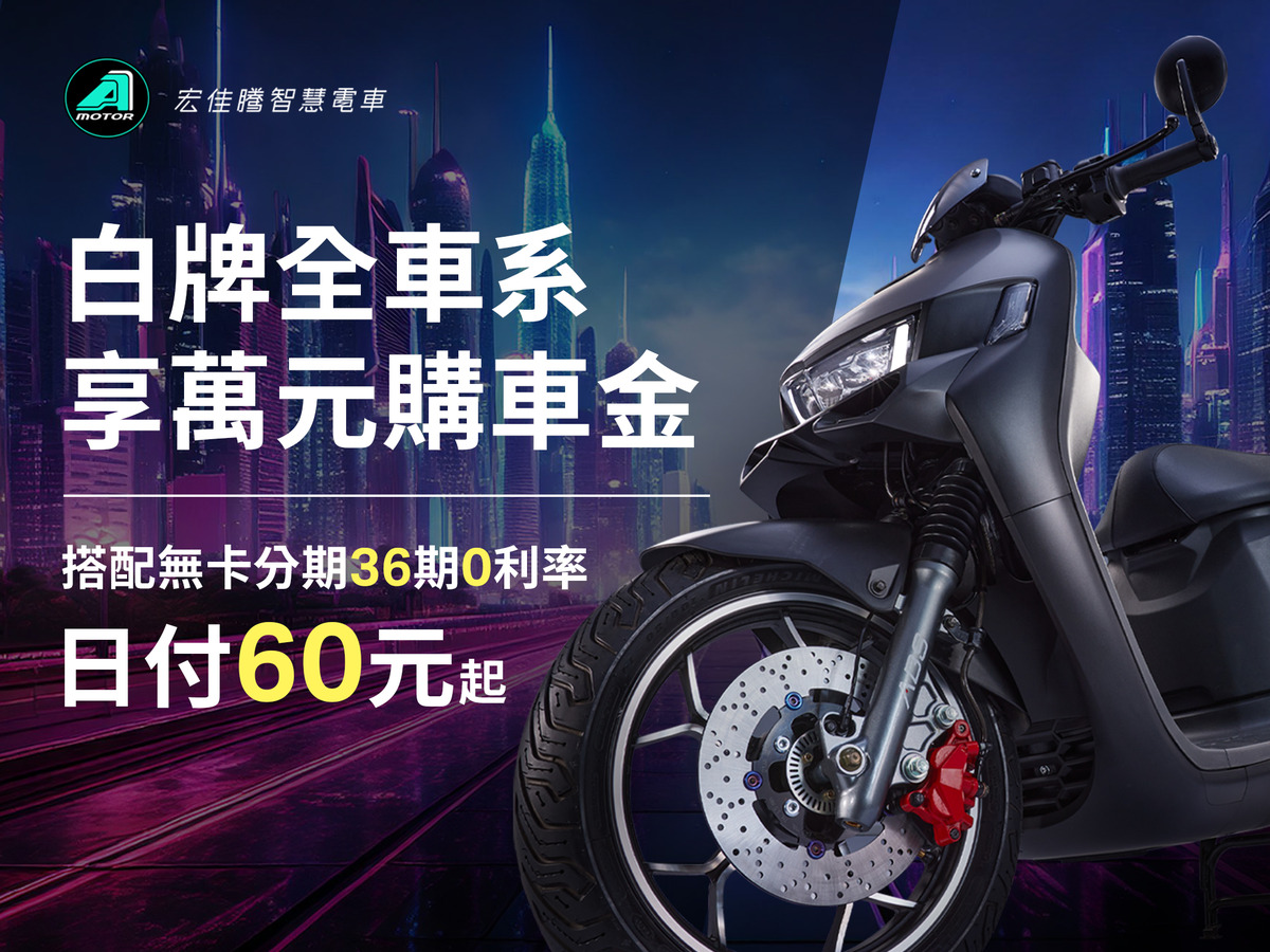 • 即日起至6月30日止,購買宏佳騰智慧電車以下車款可享優惠方案,再享政府購車最高補助$35,600元(相關補助辦法依中央及地方政府公告內容為準)。