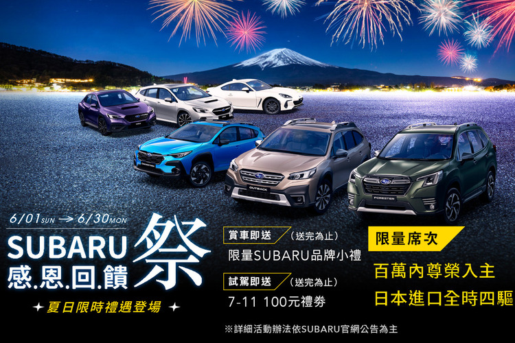 這個夏天,SUBARU為您準備更好的選擇,限時啟動、感恩回饋祭火熱進行中!即日起至6月30日止,凡至全台SUBARU展示中心賞車,即贈「限量品牌小禮」,完成試駕更送「7-ELEVEN百元商品禮券」;6月入主全車系,更可享多重夏日限時禮遇,把握難得時機,尊榮入主日本原裝進口、百萬內對稱式全時四驅SUV,名額有限,錯過不再!