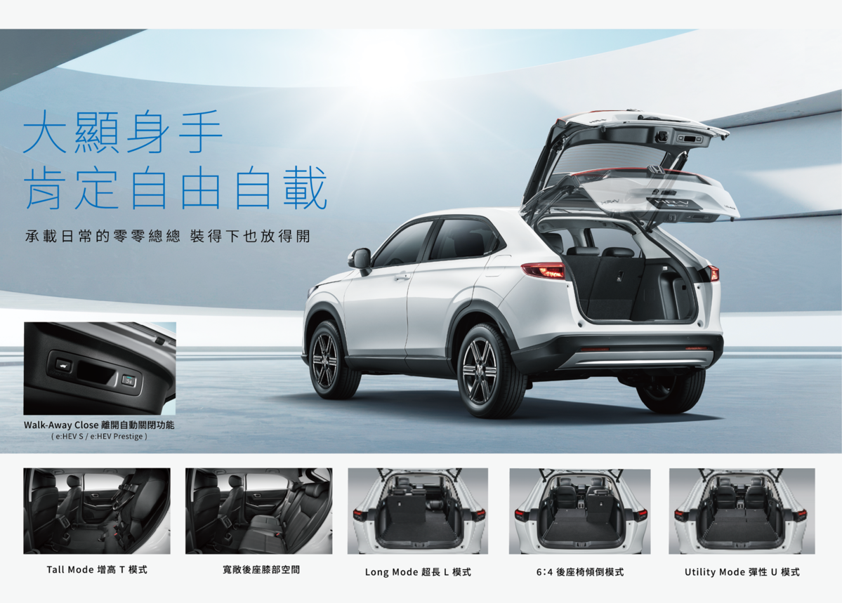 All-new HR-V車室空間延續Honda獨具一格的 「MM思想-車室空間最大化、機械空間最小化」設計理念,搭載 ULTRA SEAT 多功能座椅模式設定,讓後座座椅 6/4 傾倒後實現 100% 平整化效果,並結合行李廂空間其縱深長度達 190 公分,為車宿露營的絕佳夥伴。HR-V e:HEV車型搭載「Hands-free 感應式啟閉電動尾門附離開自動關閉」、「Walk-Away Lock 離開自動上鎖功能」、「Reserve Lock 預約上鎖功能」、「5 檔位控制附 4 段式電力再生模式方向盤快撥鍵」、「Brake Hold 智慧型煞車鎖定系統」、「Apple CarPlay/Android Auto」等多項配備提升使用便利性。
