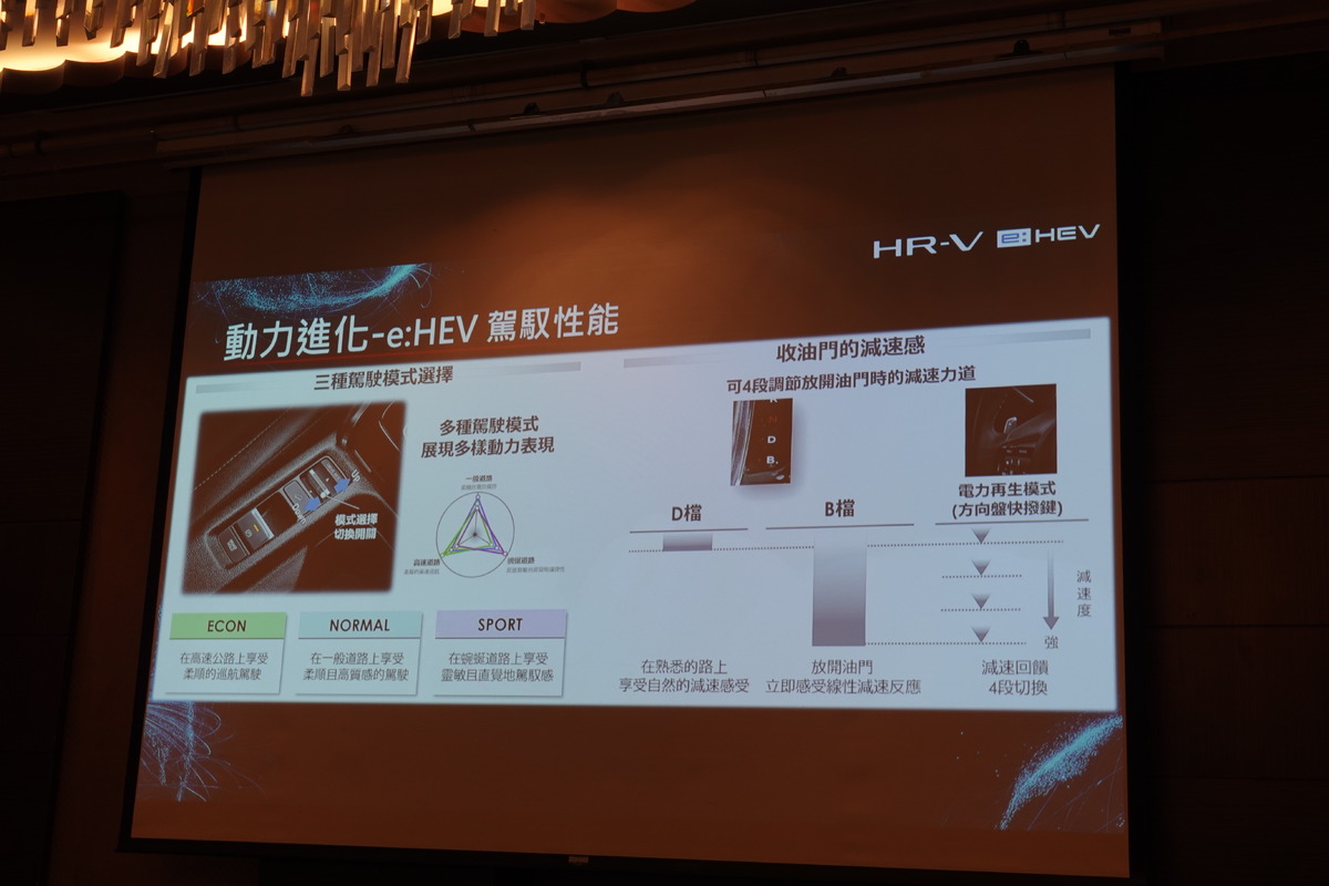 為提供駕駛更個性化的行車體驗,All-new HR-V e:HEV 搭載三種駕駛模式:ECON、NORMAL、SPORT。在高速道路上,ECON模式提供柔順的巡航感受;NORMAL模式則適合一般道路,帶來高品質且易於操作的駕駛體驗;而在蜿蜒道路上,SPORT模式則展現靈敏反應與直覺操控,滿足對操駕樂趣的渴望。此外,HR-V e:HEV車型更具備進階的四段式電力再生模式方向盤快撥鍵,不僅在 D 檔與 B 檔之間提供不同的減速強度,依照駕駛偏好選擇減速力道,無論是在市區行駛還是山道過彎,都能兼顧順暢感與操控性,HR-V e:HEV 在駕馭感受上全面進化,讓每一段旅程都能恣意馭動,盡享暢意生活。