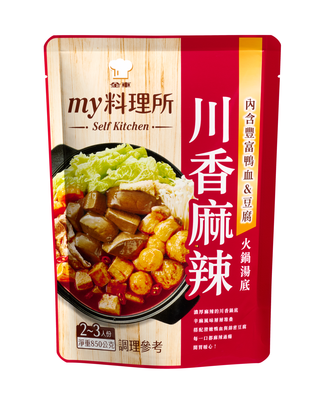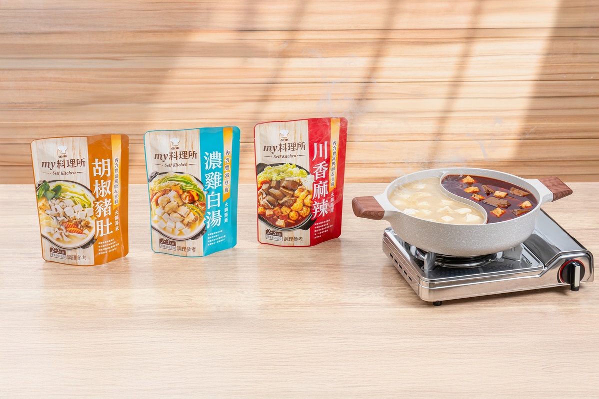 金車my料理所「胡椒豬肚火鍋湯底」、「川香麻辣火鍋湯底」、「濃雞白湯火鍋湯底」,主打湯濃味美與用料豐富。(圖片僅供參考,實際內容參見實物)