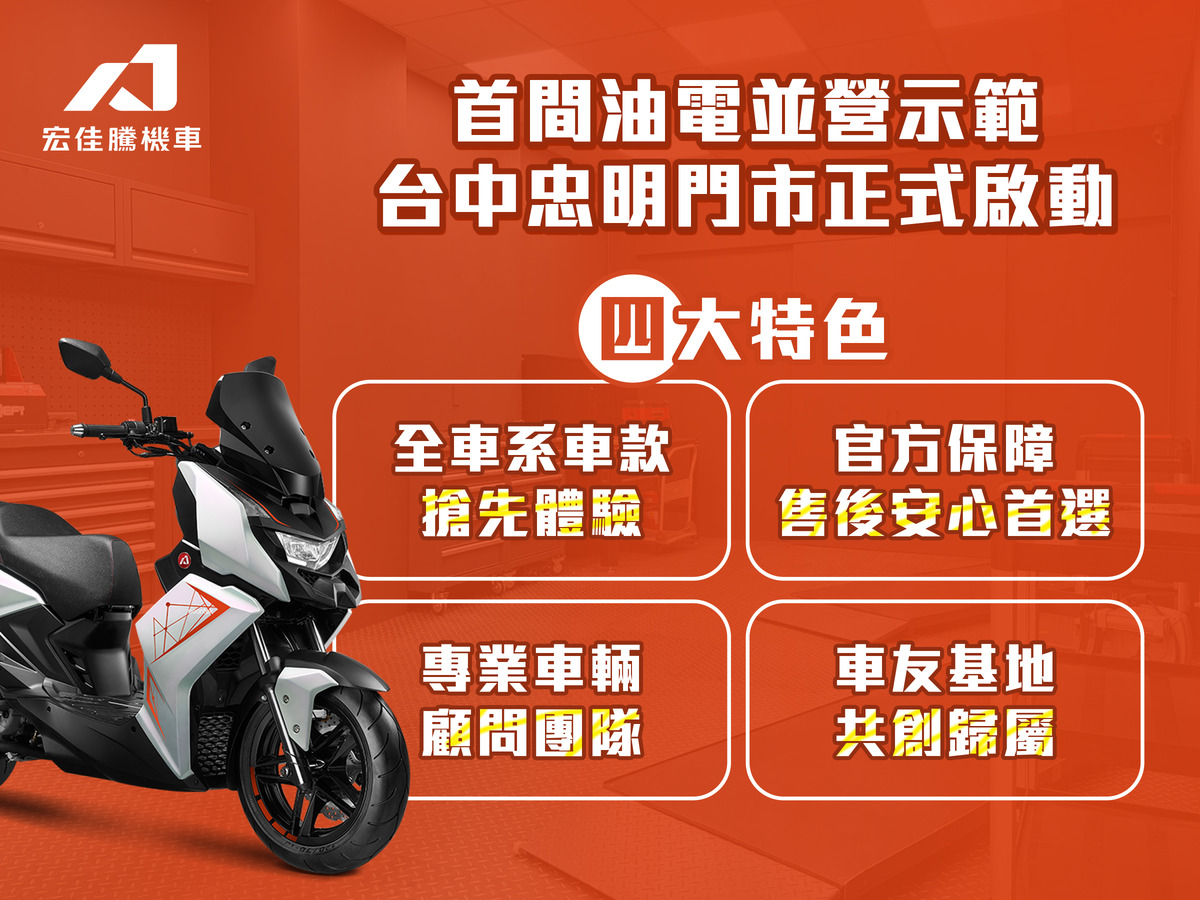 宏佳騰誠摯邀請所有車迷朋友們蒞臨台中油電直營門市,親身體驗融合科技、設計與人文精神的全新空間。未來,宏佳騰將持續推動產品、服務與通路三大升級,以創新為核心、以消費者為中心,透過智慧科技、設計美學及永續理念,持續引領台灣機車市場轉型升級,為每位車主帶來更豐富且充滿想像力的移動體驗。