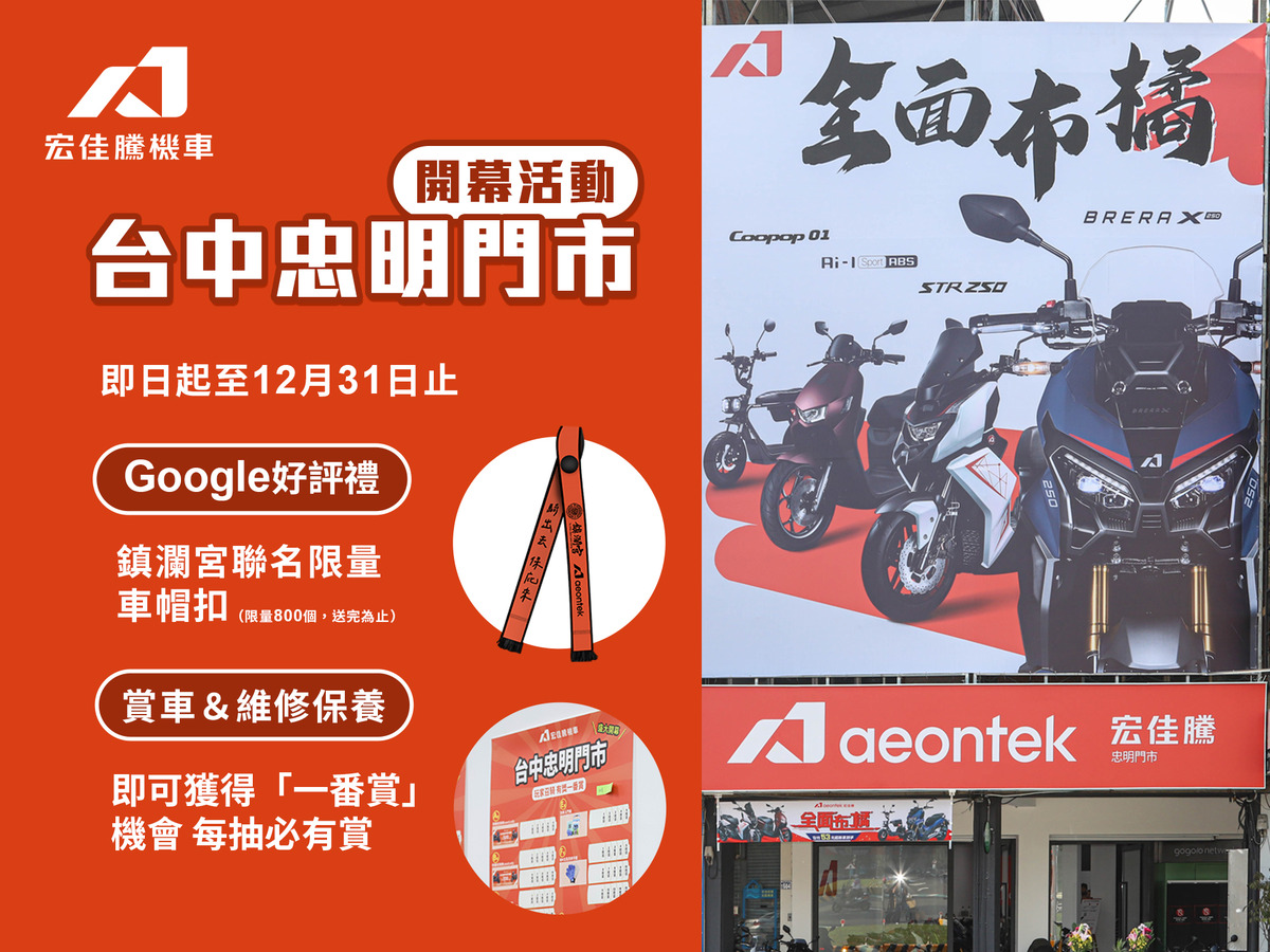隨著台中直營門市的啟用,宏佳騰「通路2.0計畫」同步穩健推進。以「油電並營」為核心方向,積極輔導全台經銷據點升級轉型,從形象統整煥新、多元產品導入,到銷售與售後團隊的原廠培訓與考核,全面強化顧客體驗,無論身處哪個城市,消費者皆能同時體驗燃油與電動車款的完整服務。而為慶祝宏佳騰全台首間油電直營門市盛大開幕,自即日起至12月31日止,台中忠明門市推出三大限時回饋活動: