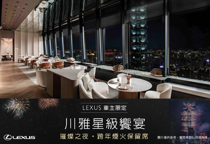 2025年末之際,Lexus邀請車主一同回顧這一年累積的精彩,並迎向2026年的全新展望。首次推出「星級餐廳-跨年煙火保留席」,攜手今年首度獲得一星殊榮、位於台北微風南山46樓的星級餐廳「川雅」,以珍稀席位呈獻跨年專屬饗宴。讓車主坐賞台北101景觀地標與城市夜景,品味正宗官府川菜的辛香層次;當午夜倒數響起,以超近距離欣賞窗外跨年煙火綻放。透過融合視覺、味覺、嗅覺的沉浸式感官體驗,陪伴車主在璀璨光影中迎接新年,完整體現 Lexus對於生活美學的獨到詮釋。