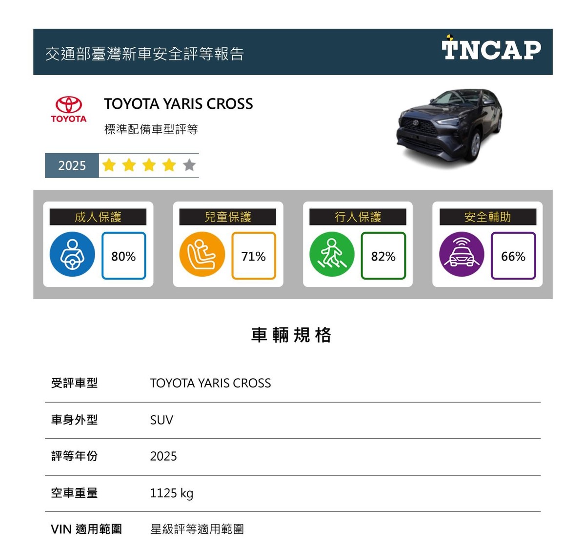 三、 TOYOTA YARIS CROSS 於四大安全領域得分率中分別獲得成人保護 80%、兒童保護 71%、行人保護 82%及安全輔助66%,依據星級評等平衡標準規定,YARIS CROSS 車型整體星級評等為四顆星。