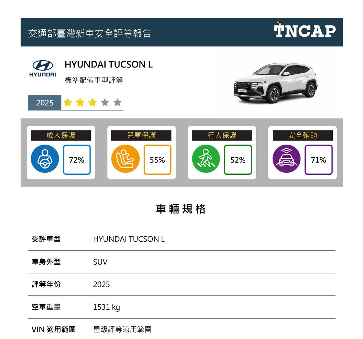 二、 HYUNDAI TUCSON L 於四大安全領域得分率中分別獲得成人保護 72%、兒童保護 55%、行人保護 52%及安全輔助 71%,依據星級評等平衡標準規定,TUCSON L 車型整體星級評等為三顆星。