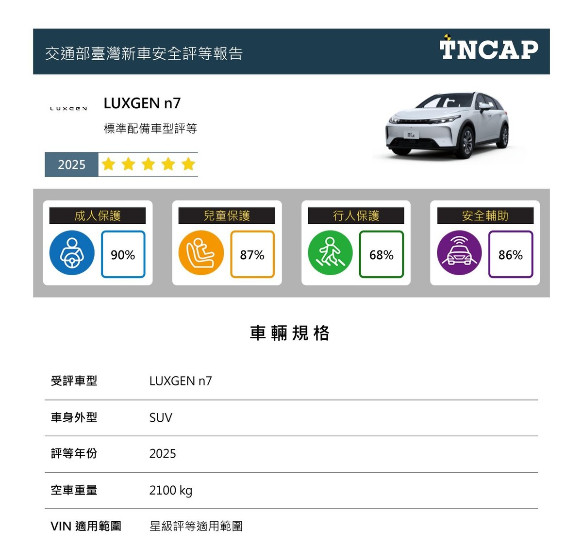 四、 LUXGEN n7 於四大安全領域得分率中分別獲得成人保護90%、兒童保護 87%、行人保護 68%及安全輔助 86%,依據星級評等平衡標準規定,n7 車型整體星級評等為五顆星。