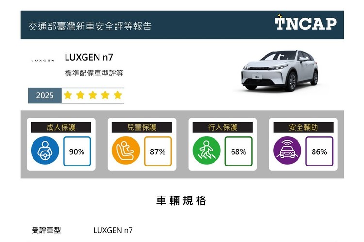 114年9月30日公告三車型 TNCAP 評等結果後,財團法人車輛安全審驗中心針對第四季四車型(HYUNDAI CUSTIN、HYUNDAI TUCSON L、TOYOTA YARIS CROSS 及 LUXGEN n7),依「交通部執行臺灣新車安全評等作業要點」及「交通部臺灣新車安全評等規章」執行 TNCAP 主動、被動安全評等試驗,辦理完成計分及轉換星級評等,結果說明如下,其中 TOYOTA YARIS CROSS 及 LUXGEN n7 車型首次分別選擇交通部新增指定的西班牙 IDIADA 及美國 CALSPAN國外檢測機構執行試驗,國內外送測作法皆一致,均依 TNCAP 規章辦理,展現業界對 TNCAP 制度的認同,亦代表 TNCAP 與國際作法接軌,持續邁向國際化,本次揭露四車型評等詳細內容可至 TNCAP 專屬網站參閱相關安全資訊(網址 https://www.tncap.org.tw/SafetyRatings/):