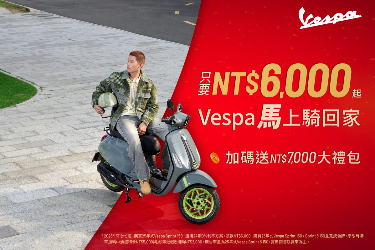 迎接2026新年,1月正是啟動全新風格生活的絕佳時機!Vespa總代理太古運通為與車迷共啟新旅程,1月特別挑選極具人氣的Sprint車款推出限時購車優惠,即日起至2026年1月31日(六)止,凡本月購車並且完成掛牌25年式Sprint 150或Sprint S 150,即可以0%利率NT$6,000頭款入手指定車型,並加碼贈送總價值NT$7,000開春大禮包,讓消費者在2026年初始,即刻享受最有感的加「馬」回饋,優惠內容如下:
