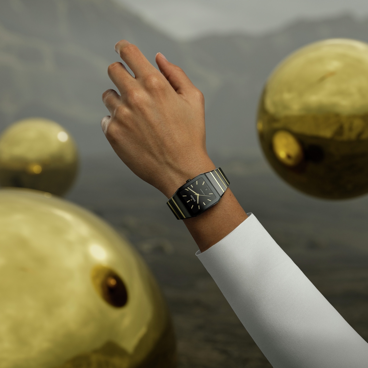 年末的光不一定要喧嘩,有些質感只要角度一轉就會被看見。此款以品牌獨有的電漿高科技陶瓷打造錶殼與鍊帶,呈現介於金屬與高科技陶瓷之間的溫潤光澤,線條俐落卻不冷硬。方形錶殼搭配藍寶石水晶鏡面,使輪廓更乾淨通透。錶盤運用特殊電鑄工藝複製鑽石粉末的晶體結構,形成細緻的金屬紋理質感,並以黃金色立體時標與同色錨型標誌提亮層次。黃金色指針覆以白色 Super-LumiNova®,在不同光線下依然清晰易讀。腕錶搭載 Rado R734 自動上鍊機芯,具備 80 小時動力儲存、Nivachron™ 防磁游絲並通過五方位調校,讓外在的閃耀與內在的穩定同時到位。