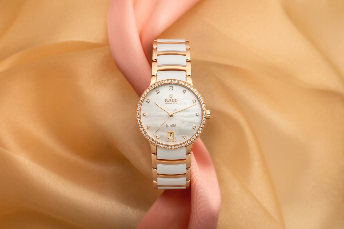 白色珍珠母貝錶盤,Jubilé 標誌款式,鑲嵌 12 顆鑽石,120/125,頂級威塞爾頓鑽石,淨度 VS-SI,足瓣切割,總重 0.085 克拉,玫瑰金色可轉動錨型標誌,玫瑰金色 Rado 及 Automatic 標誌印刷。