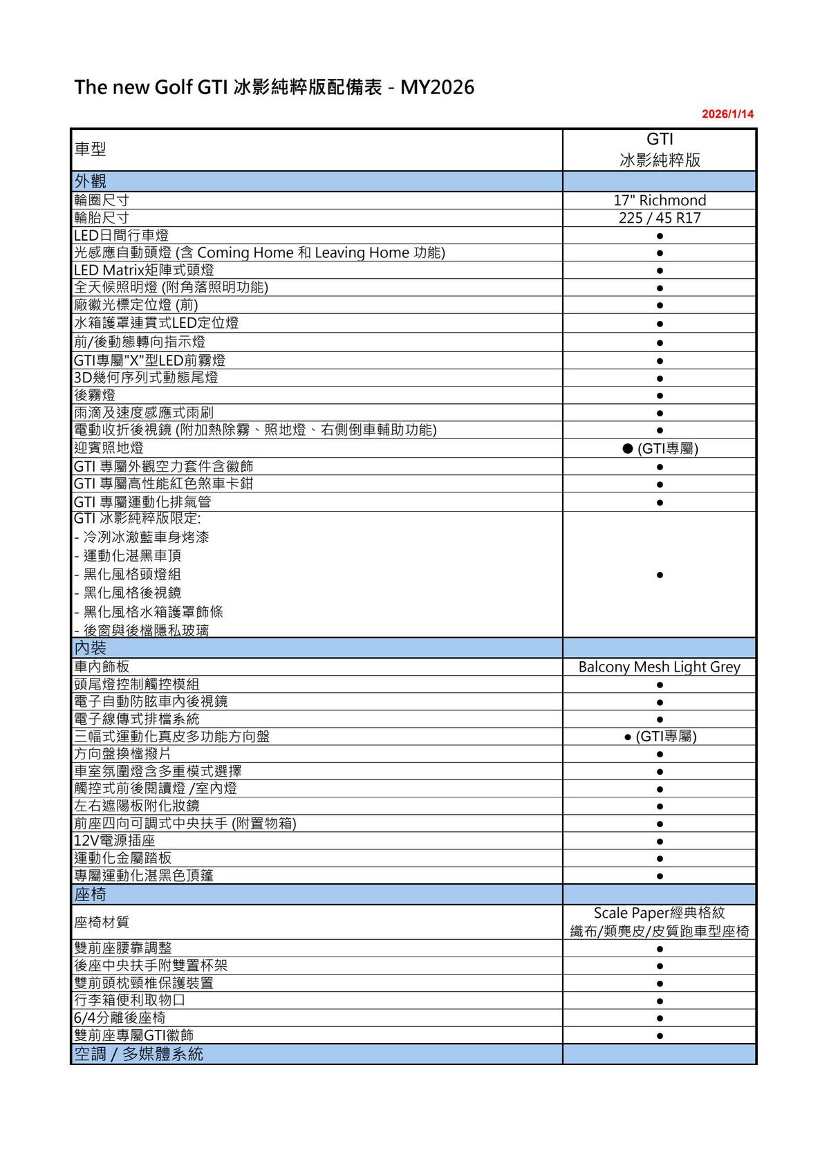●為慶祝 GTI 問世 50 週年,The Golf GTI 冰影純粹版以紀念首發之姿登場,為 Golf 家族揭開新年熱血序章。