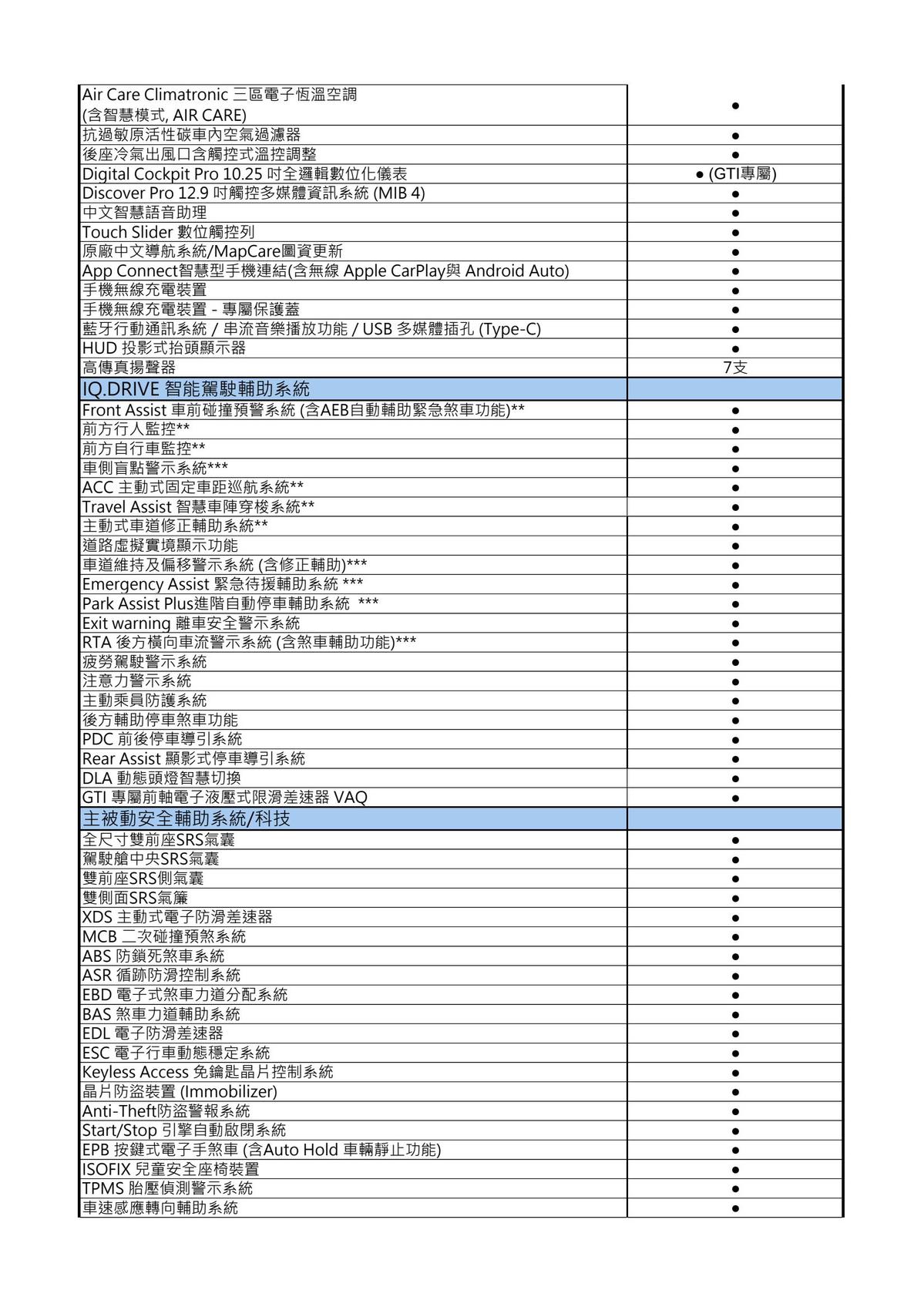 座艙空間同樣延續 GTI 精神,配備 GTI 經典格紋跑車座椅、多功能運動方向盤與 GTI 專屬運動化儀表介面,構築濃厚熱血氛圍;搭載 Discover Pro 12.9 吋觸控式多媒體資訊系統(MIB4)與 HUD 抬頭顯示器(投影式),將關鍵駕駛資訊直覺呈現於視線前方,讓性能駕馭與科技便利無縫整合,於恣意馳騁之際,同步兼顧日常行車的舒適與守護。照明科技方面,標配 IQ.LIGHT:HD Matrix 矩陣式 LED 頭燈組(附 DLA 動態頭燈自動切換)