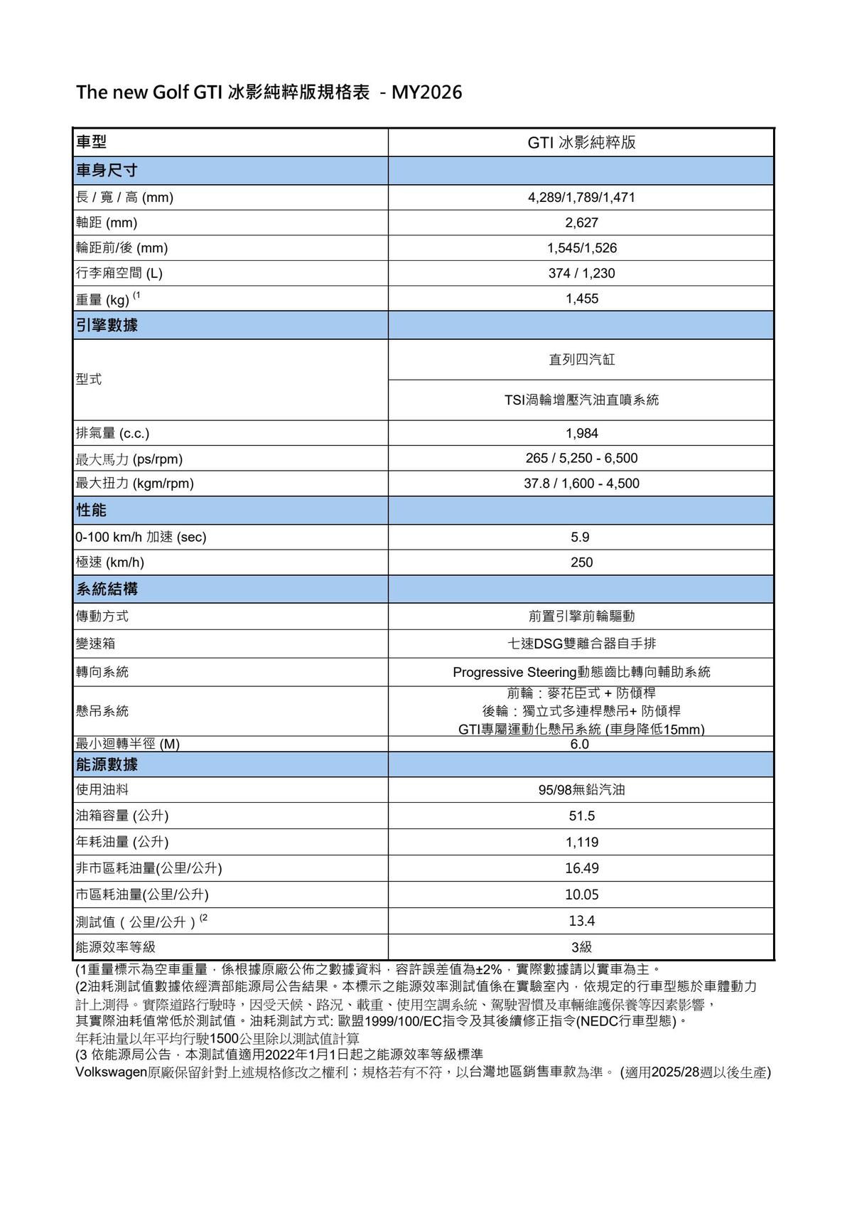 ●動力核心搭載 EA888 EVO4 2.0 升 TSI 渦輪增壓引擎,輸出 265ps 最大馬力與 37.7kgm 峰值扭力,結合 GTI 專屬前軸電子液壓式限滑差速器 VAQ 與 Vehicle Dynamic Manager 車輛動態管理系統,於彎道與高速行駛時精準分配扭力,帶來穩定、敏捷且充滿信心的操控表現。