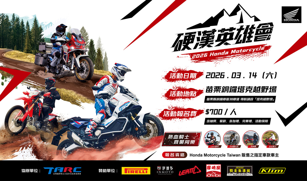 「2026 Honda Motorcycle 硬漢英雄會」特別選擇於場地地形豐富、極具騎乘樂趣的苗栗塔克越野場舉辦,活動現場規劃多項關卡體驗,包含基礎越野騎乘知識分享、車輛設定等,讓車主提升自我騎乘技巧及信心,享受突破自我的成就感,同時也安排林道騎乘路線,由專業的教練帶領車主實際感受ADV系車款在非鋪裝道路騎乘的真正魅力,為提升活動互動樂趣,特別邀請多位知名二輪媒體及YouTuber到場同樂,亦規劃抽獎與多項趣味活動以及豐盛的餐飲,全新2026年式Africa Twin ES也將首次亮相,讓參與的車主在挑戰之餘,也能享受輕鬆愉快的氛圍,期望透過「2026 Honda Motorcycle 硬漢英雄會」,讓更多車主親身體驗ADV系車款的騎乘魅力與冒險精神,鼓勵騎士勇敢探索未知、拓展騎乘視野。名額有限,歡迎所有Honda ADV系車主把握機會踴躍報名,與全台同好一同在苗栗塔克越野場,開啟屬於自己的硬派冒險篇章。