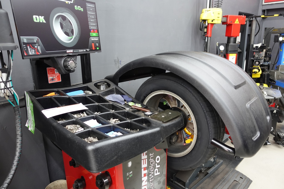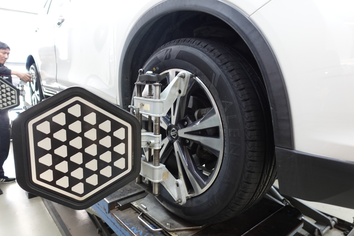 步驟三:四輪全部安裝後以四輪定位系統測量四個輪胎的幾何角度(外傾角、前束角、後傾角)重新校準至原廠設定值。讓輪胎接觸地面時達到最佳角度,從而確保直線行駛平穩、轉向靈活度並避免輪胎異常磨損。