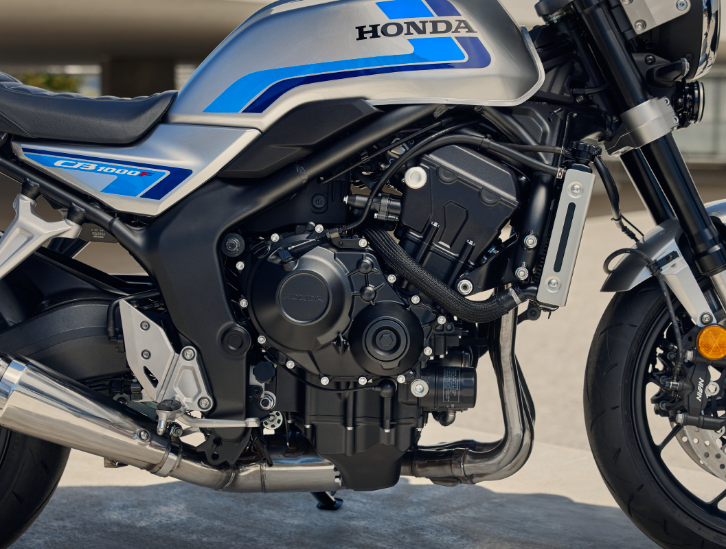 CB1000F的外觀設計充分展現獨特風格。流暢俐落的車身線條自油箱一路延伸至車身側蓋,構成極具辨識度的鮮明輪廓。簡潔且充滿力量感的設計語彙,融合經典元素在多項配備之中,包括圓形頭燈搭配雙喇叭配置、經典的雙色油箱塗裝,營造出濃厚復古氛圍。動力方面,搭載源自Honda標誌性的CBR1000RR Fireblade四缸引擎,並透過多項專屬調校帶來截然不同的動力表現。包含重新設計的進排氣凸輪軸與更優異的進氣設定,使引擎可輸出最大馬力102 hp/8,000 rpm,以及最大扭力9.3kg m/8,000 rpm。經過重新調校後的動力輸出更著重於日常騎乘的實用性,提供綿密且均衡的性能表現,同時帶來極具魅力的四缸引擎聲浪。