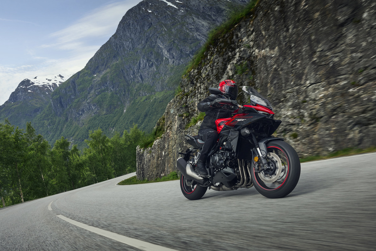 搭載1000c.c.直列四缸引擎,透過電子油門系統,精準控制動力輸出,在保留強勁性能的同時帶來更加平順綿密的加速表現,無論長途巡航或熱血操駕都能展現從容且線性的動力特性。在車體設計方面,CB1000GT以長途騎乘舒適性為核心,提供充裕的騎士與乘客乘坐空間,讓雙人長途旅行也能維持舒適姿勢。懸吊系統採用Showa-EERA™電子懸吊系統,可依不同騎乘情境調整阻尼設定,兼顧穩定性與操控表現,並透過六軸慣性慣性測量系統(IMU)以及彎道ABS(Cornering ABS),在各種路況與騎乘情境下提供更高水準的安全。